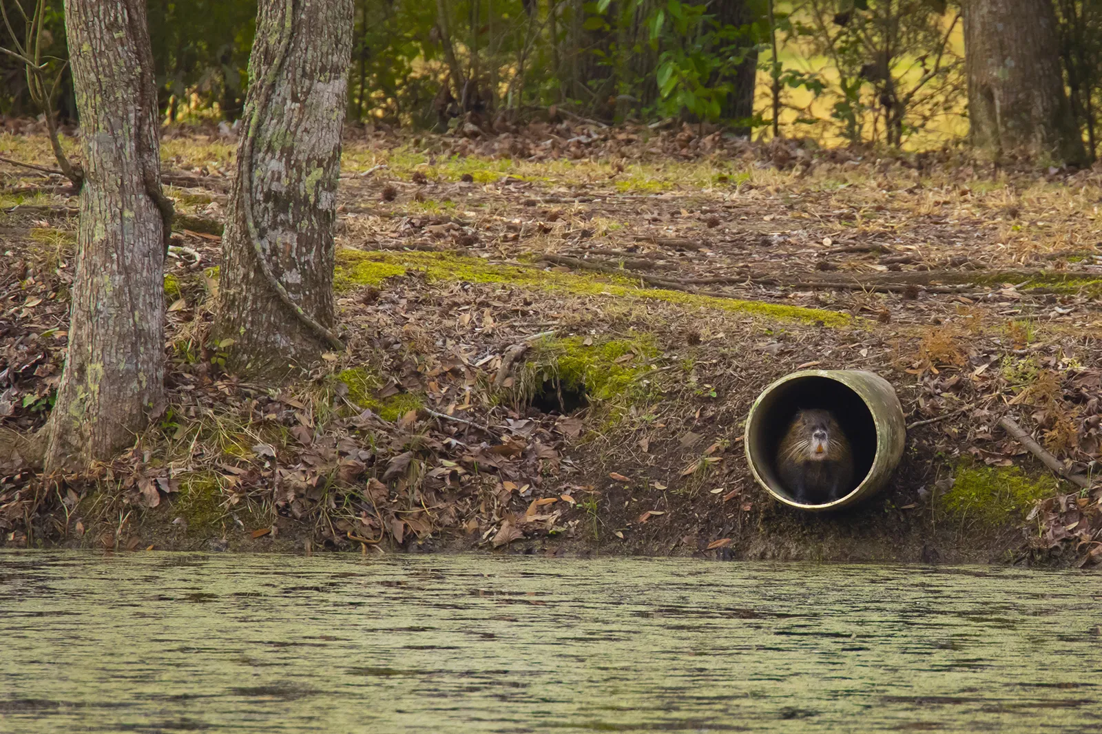 Looked out of my living room window and noticed a healthy nutria rat staring in my direction in his cozy little urban tiny house.
