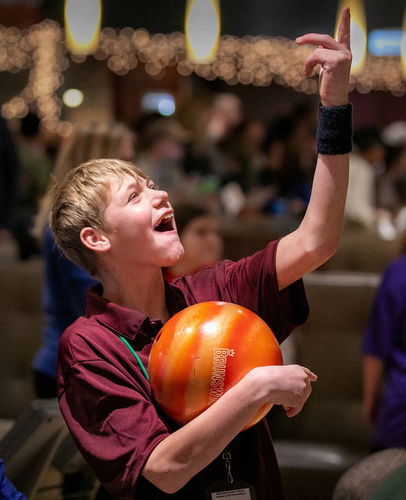 An athlete reacts to his score during the bowling portion of the Special Olympics Georgia Indoor Winter Games in Marietta, Ga.