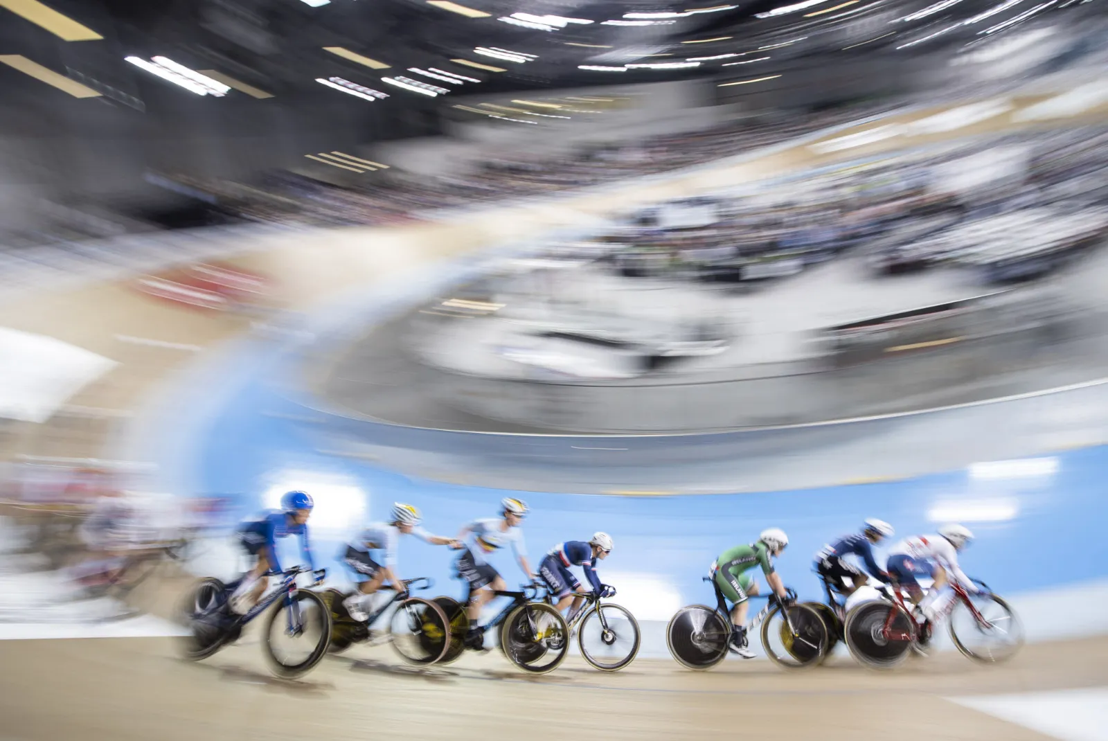 Cyclists bank a corner during the Tissot UCI Track World Cup, at the Mattamy National Cycling Center in Milton, Canada.