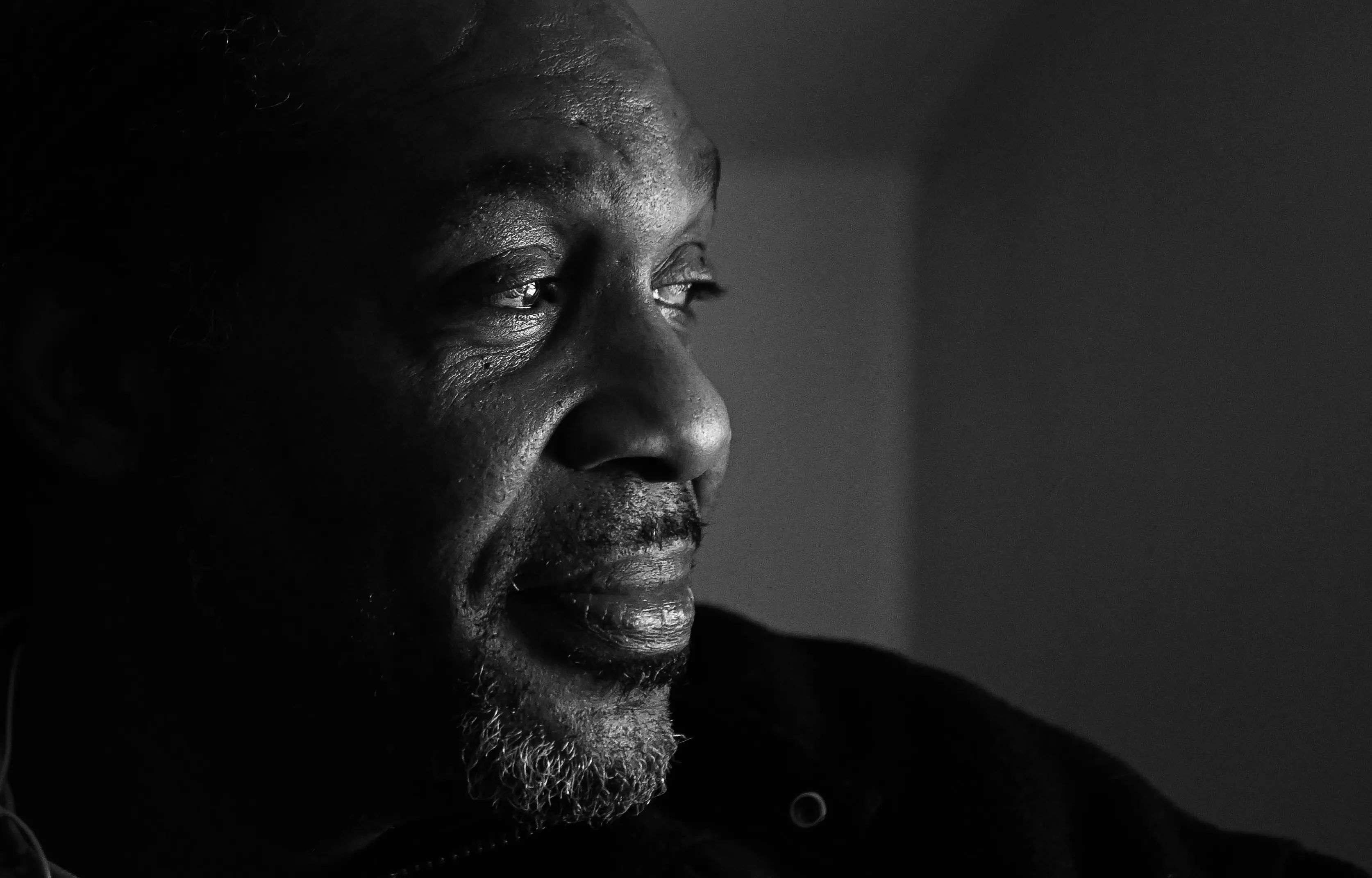 Navy veteran, Sheldon Salonis is seated before a window in his bedroom.