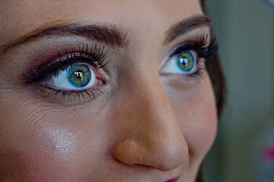 The groom is reflected in the bride's eyes as they see each other for the first time on their wedding day.
