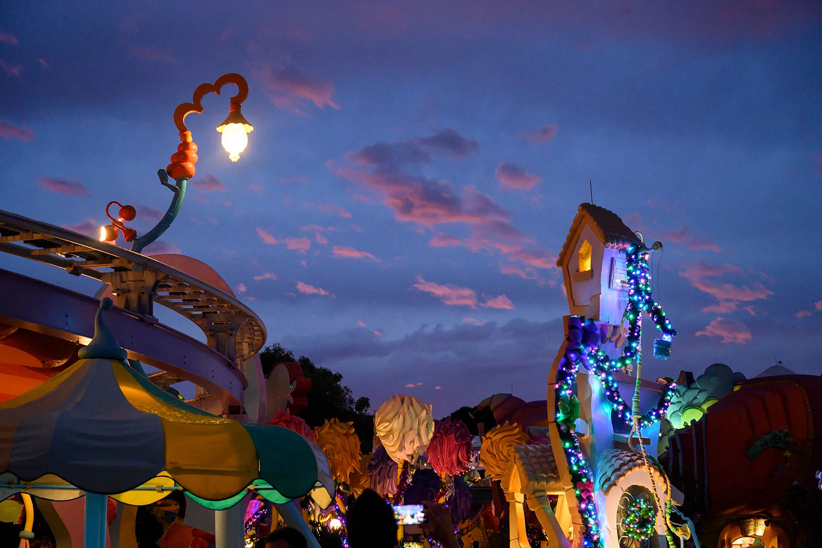 Based on Thneedville from Dr. Seuss's The Lorax, the sun sets behind Seuss Landing at Universal Studios theme park in Orlando, Florida.
