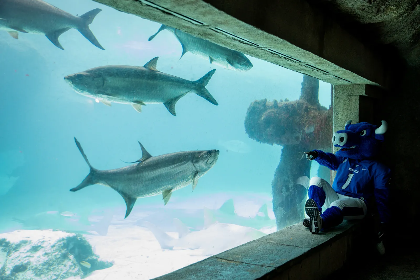 UB mascot Victor E. Bull takes a tour of the Atlantis Paradise Island Bahamas on Dec. 19, 2019. He stopped by the pools, the Predator Tunnel, the beach and the pool.
