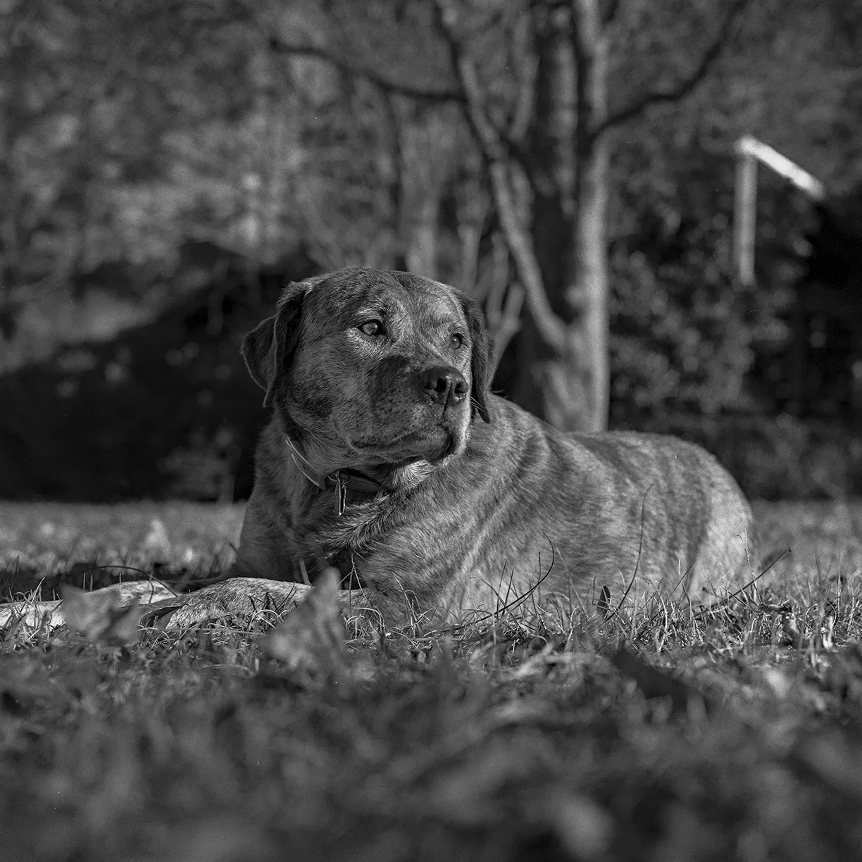 My mountain cur watches the sunset on the front yard on a warm December afternoon