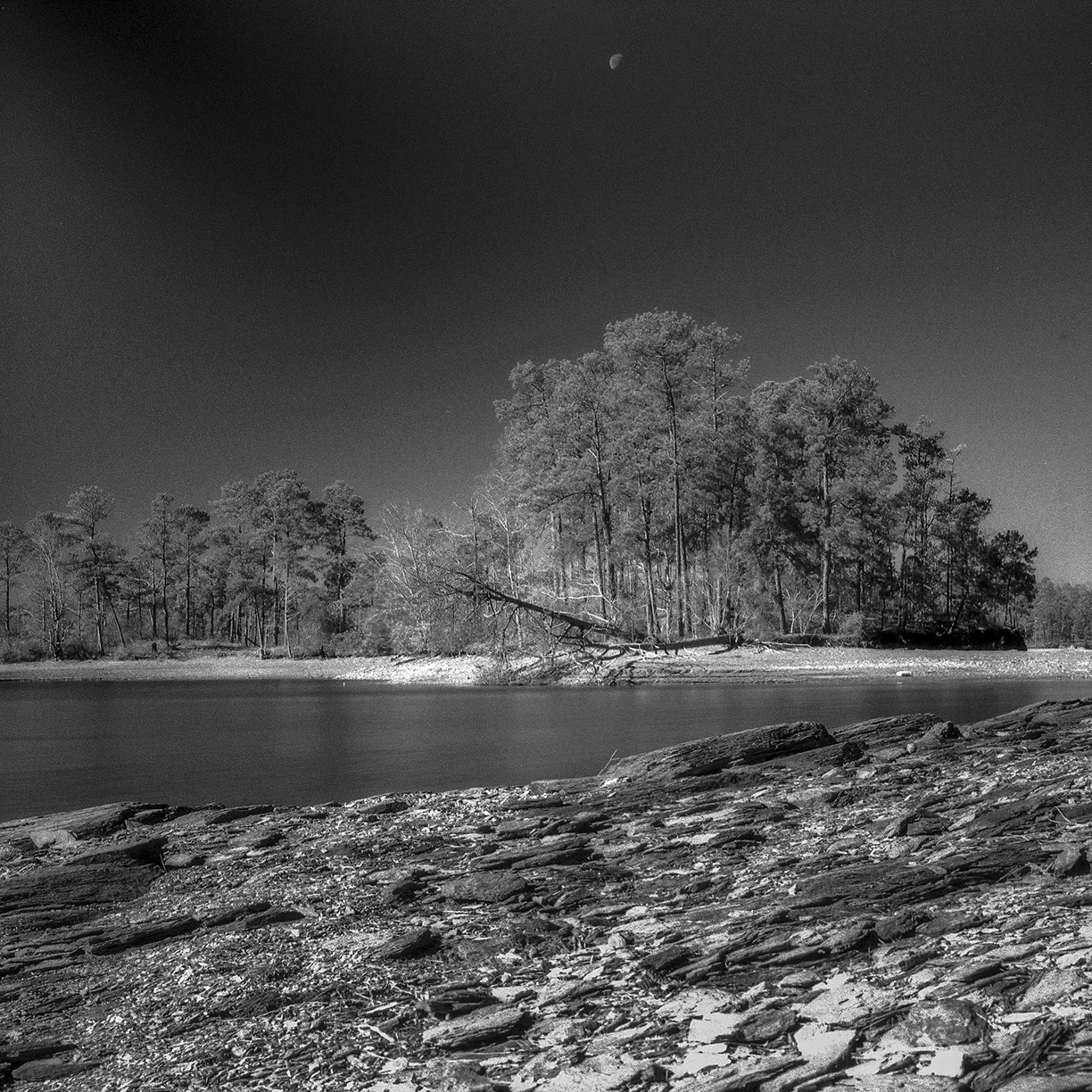 The moon is seen over an island on Lake Martin, taken from a favorite hiking trail