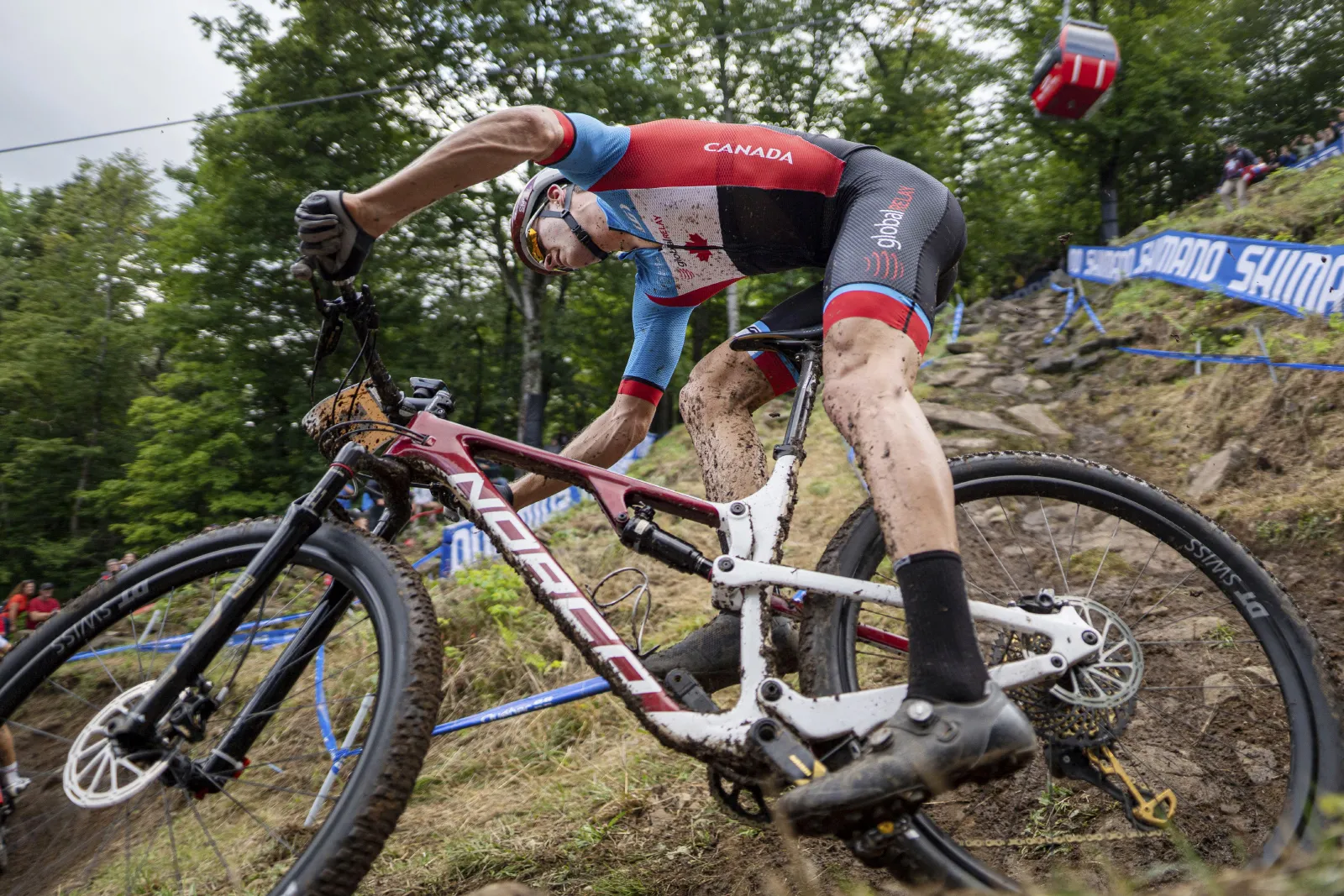 Canadian rider Peter Disera competes in XCO during the 2019 UCI Mountain Bike World Championships in Mont-Sainte-Anne, Quebec, September 1, 2019.