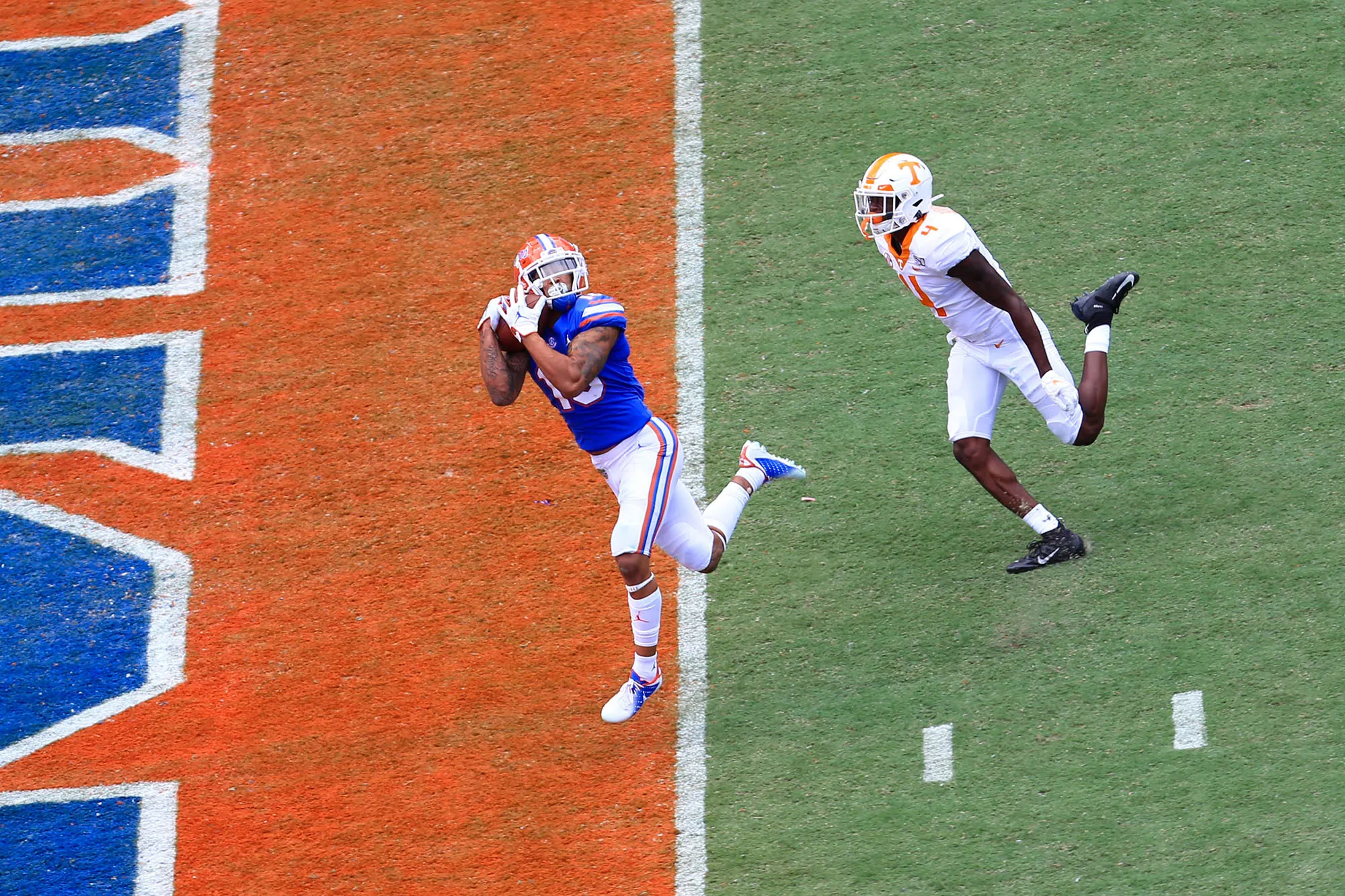Florida Gators wide receiver Freddie Swain (16) catches a touchdown in front of Tennessee Volunteers defensive back Warren Burrell (4) during an NCAA college football game Saturday, Sept. 21, 2019, in Gainesville, Fla. Florida defeated Tennessee 34–3.