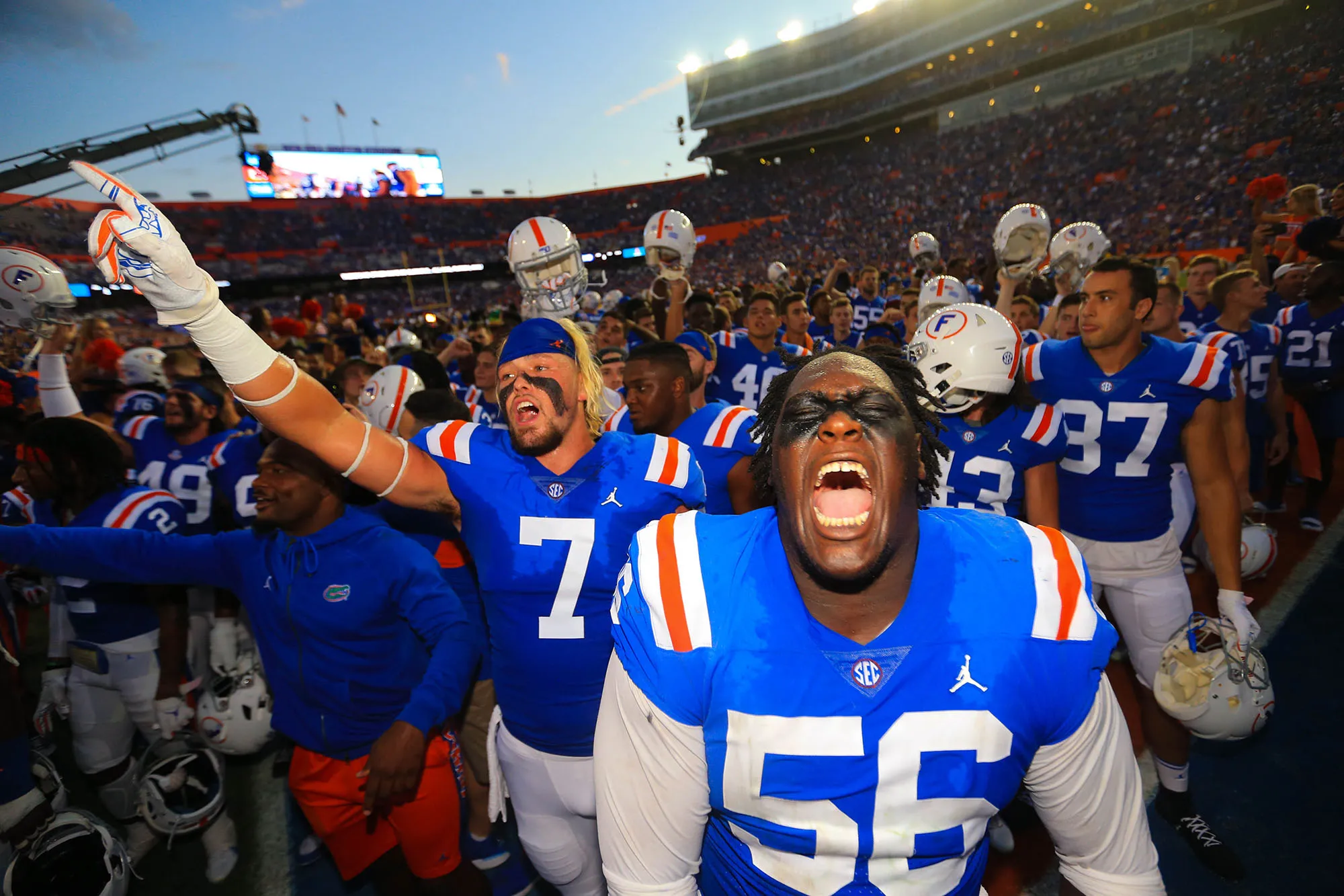 Florida Gators tight end Lucas Krull (7) and defensive lineman Tedarrell Slaton (56) celebrate after an NCAA college football game against the Auburn Tigers Saturday, Oct. 5, 2019, in Gainesville, Fla. Florida defeated Auburn 24-13.