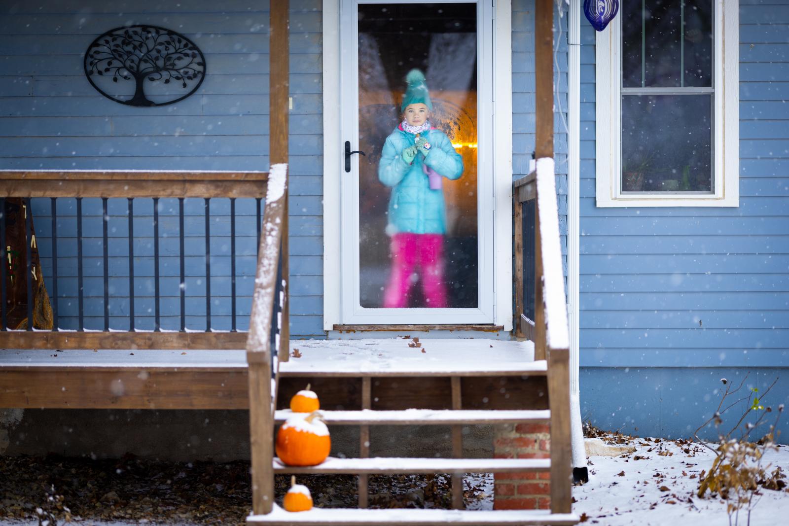 Iris watches her siblings play in the snow from the warmth and comfort of inside her home on Nov. 30, 2024 in Manhattan Kansas. An unexpected snow storm dumped about 2 inches the day after Thanksgiving giving the kids their first chance to play in the snow.
