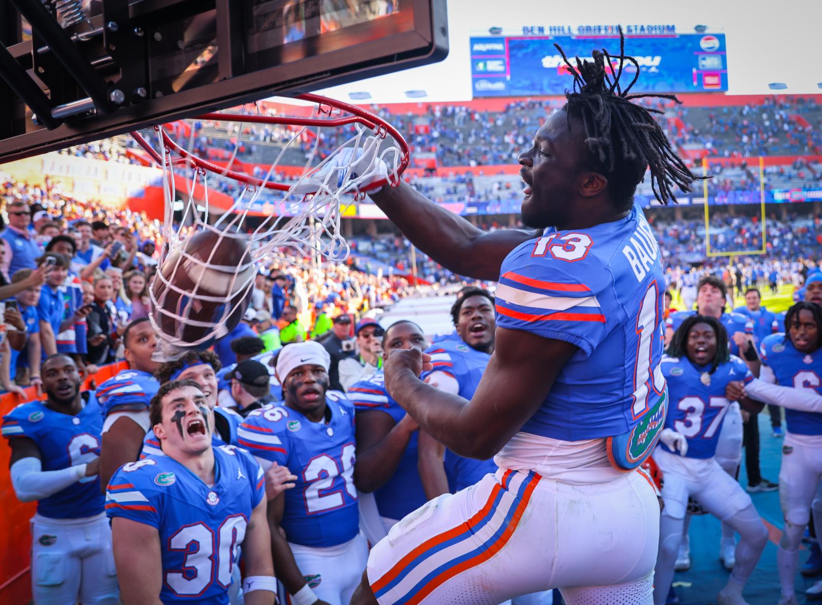 Florida Gators players have a dunk contest after defeating the Ole Miss Rebels on Saturday, November 23, 2024 at Ben Hill Griffin Stadium in Gainesville, Florida. Ole miss had the basketball goal on their sideline during the game and the Gators players set it up and dunked on it while celebrating their win.