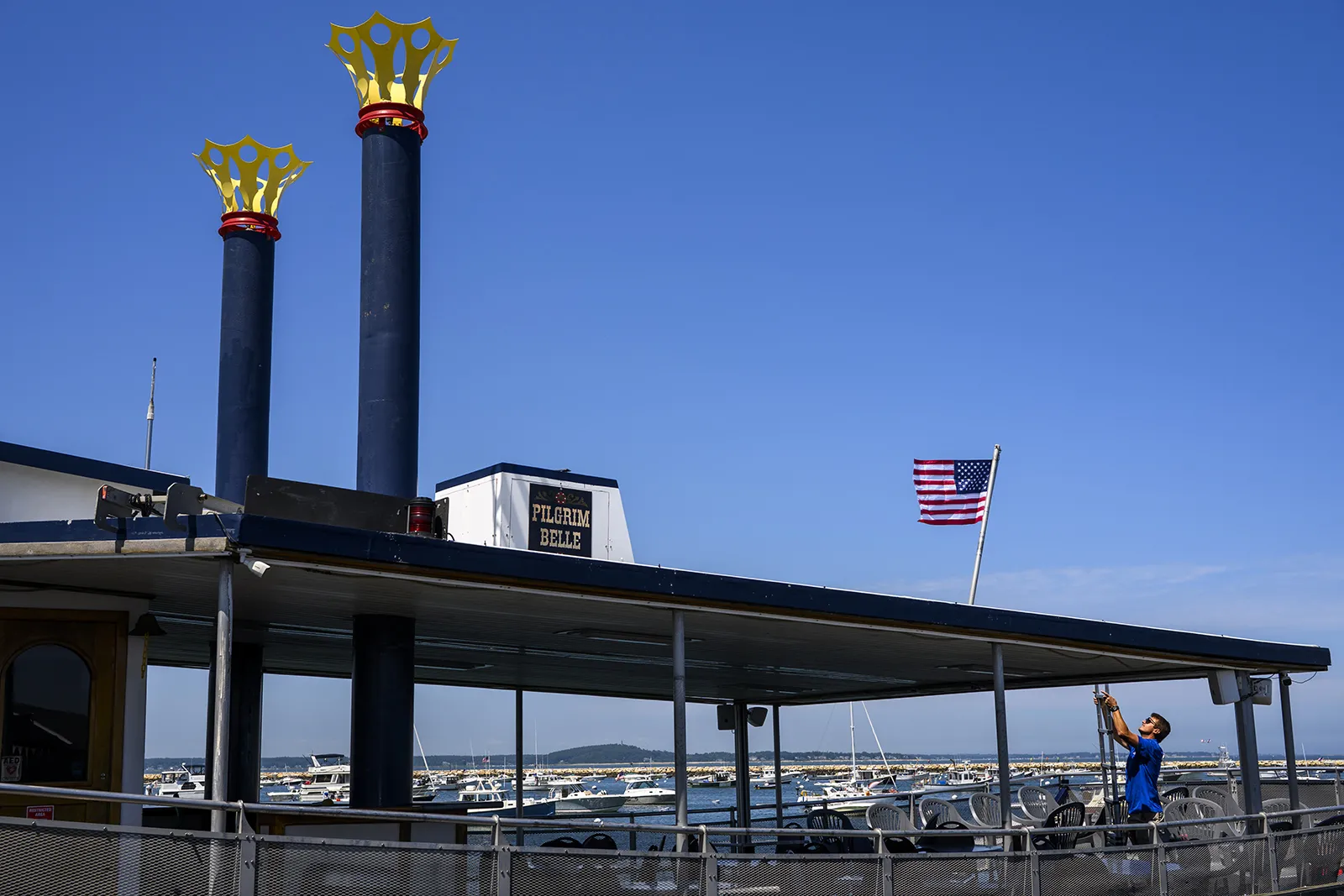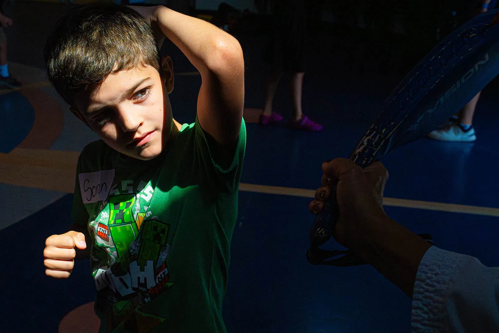 A University School of Milwaukee summer camper practices his blocking technique during Tae Kwon Do camp, caught in a spot of light.
