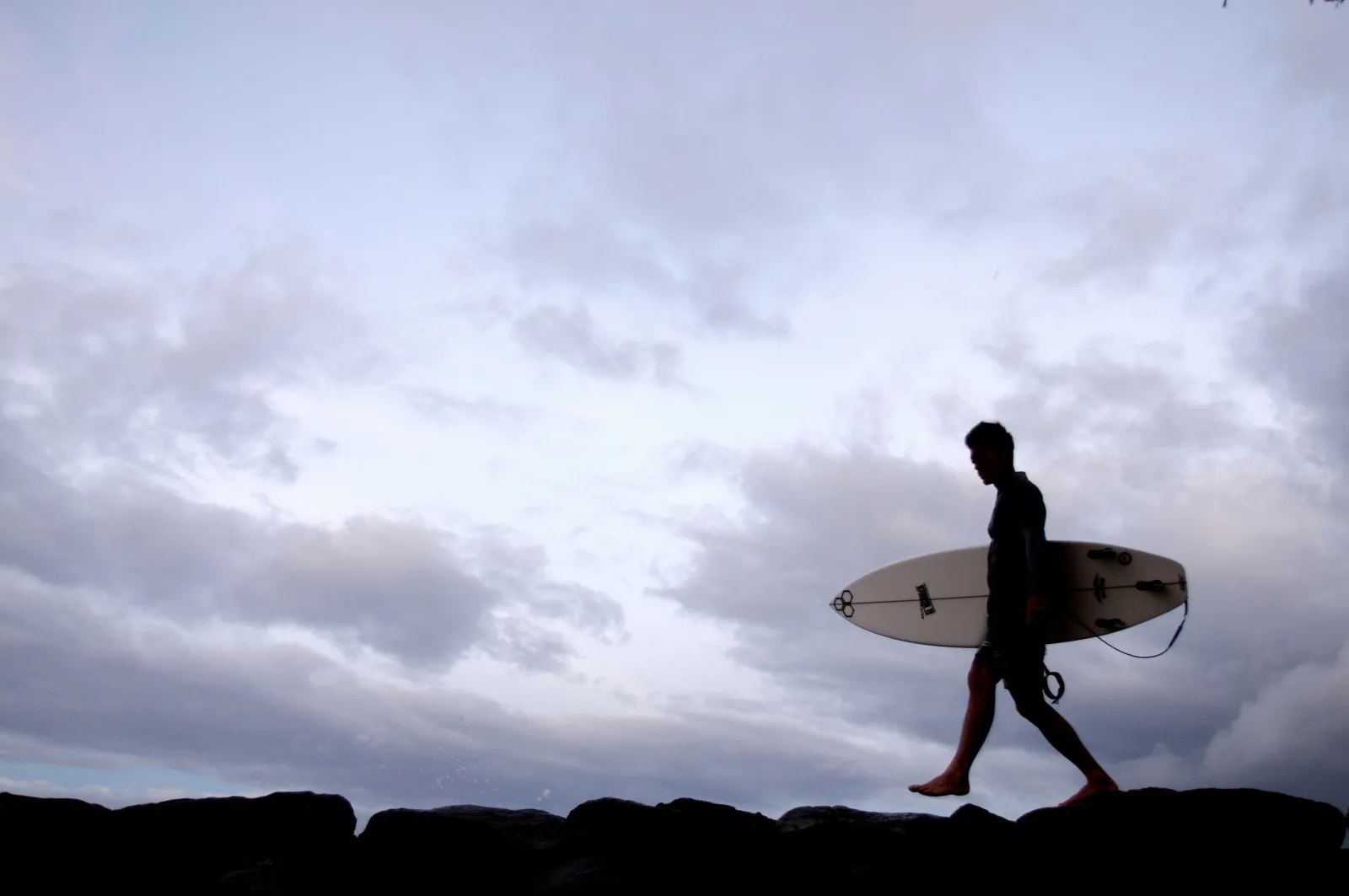A surfer walks the rock breakers to go out to surf off Waikiki.