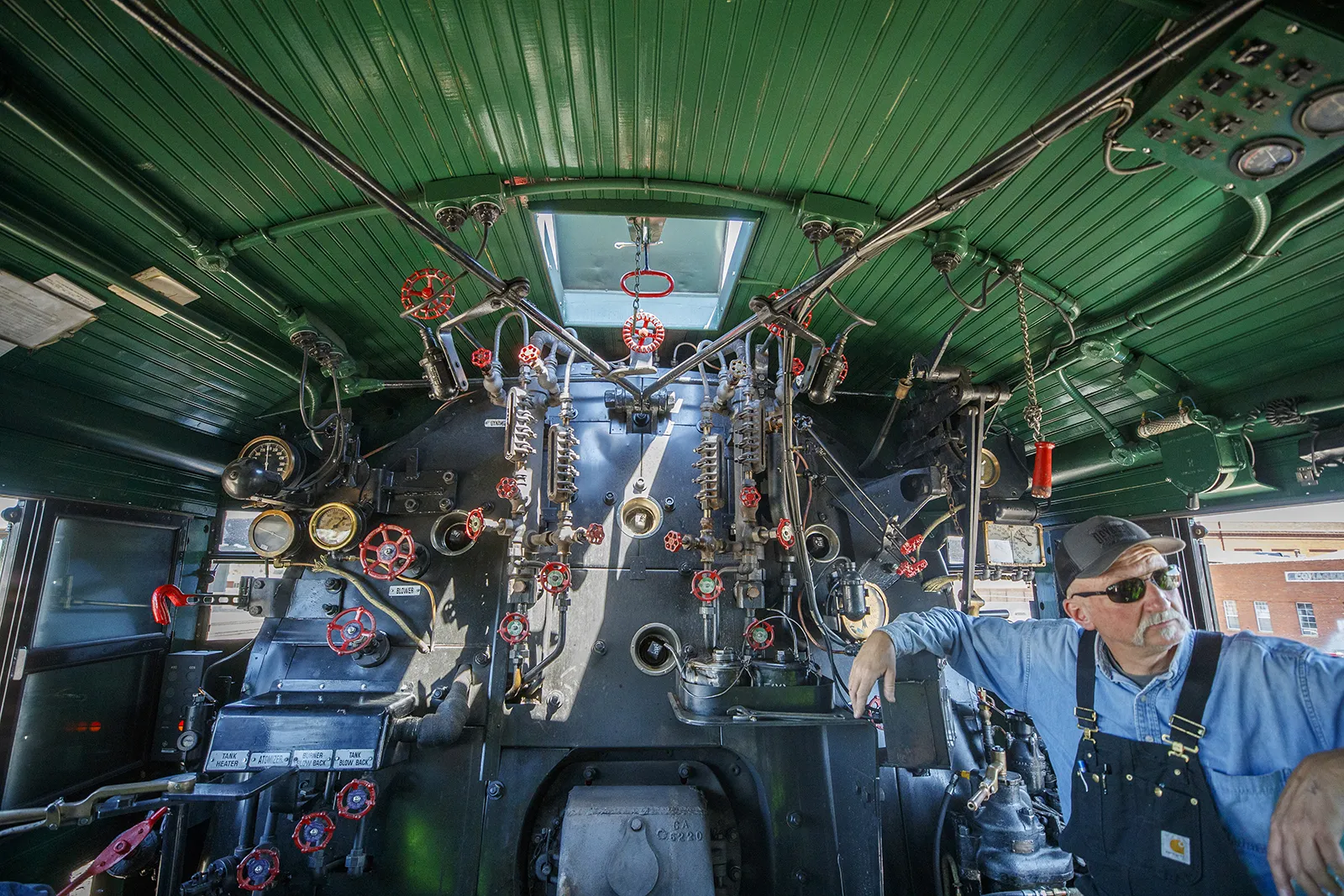 Surrounded by the dozens of valves and levers needed to run a steam locomotive, the engineer of Union Pacific 4014, the world largest steam locomotive and nicknamed "Big Boy", looks out the cab window after the engine stopped for the day as part of a tour to show off the restored locomotive.