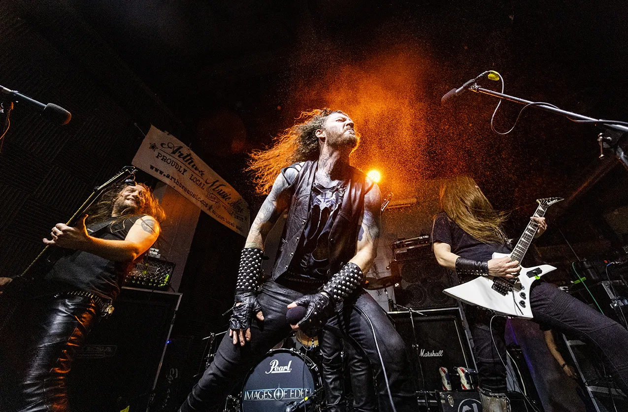 Dustin Boltjes, of the band Sacred Leather, spits water as he bangs his head during the band's performance at Black Circle Brewery in Indianapolis.