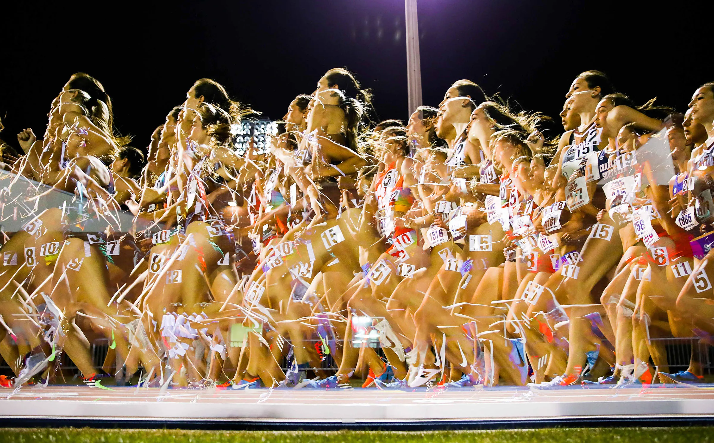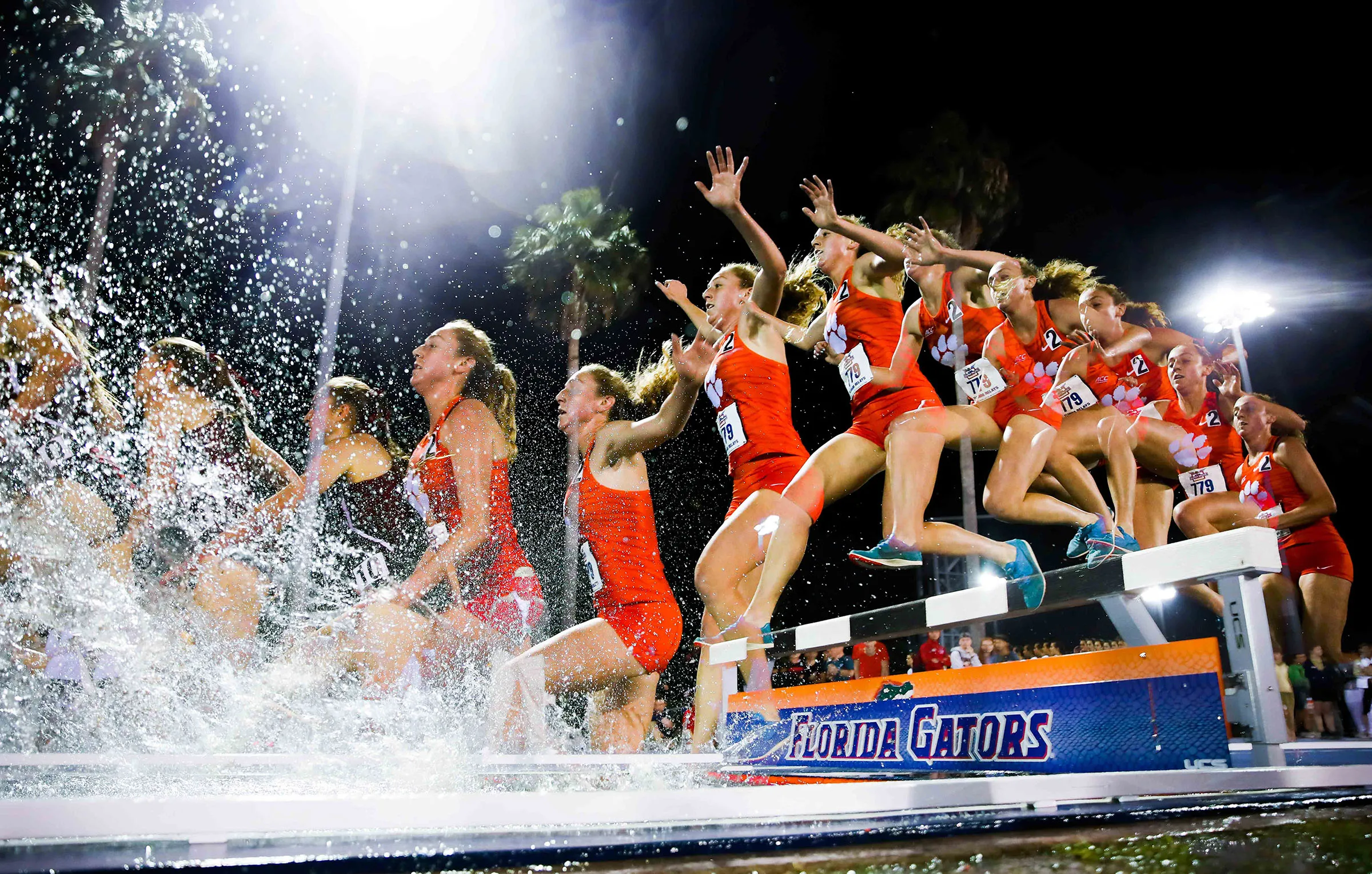 Multiple exposure image of a runner in the steeplechase race during the Florida Relays at James G. Pressly Stadium on Thursday, March 28, 2019 in Gainesville, Fla.