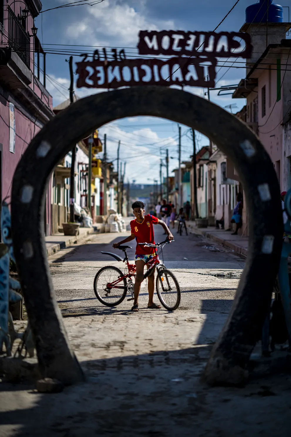 A young boy looks down into the art district of Cienfuegos, Cuba before riding off on his bike.