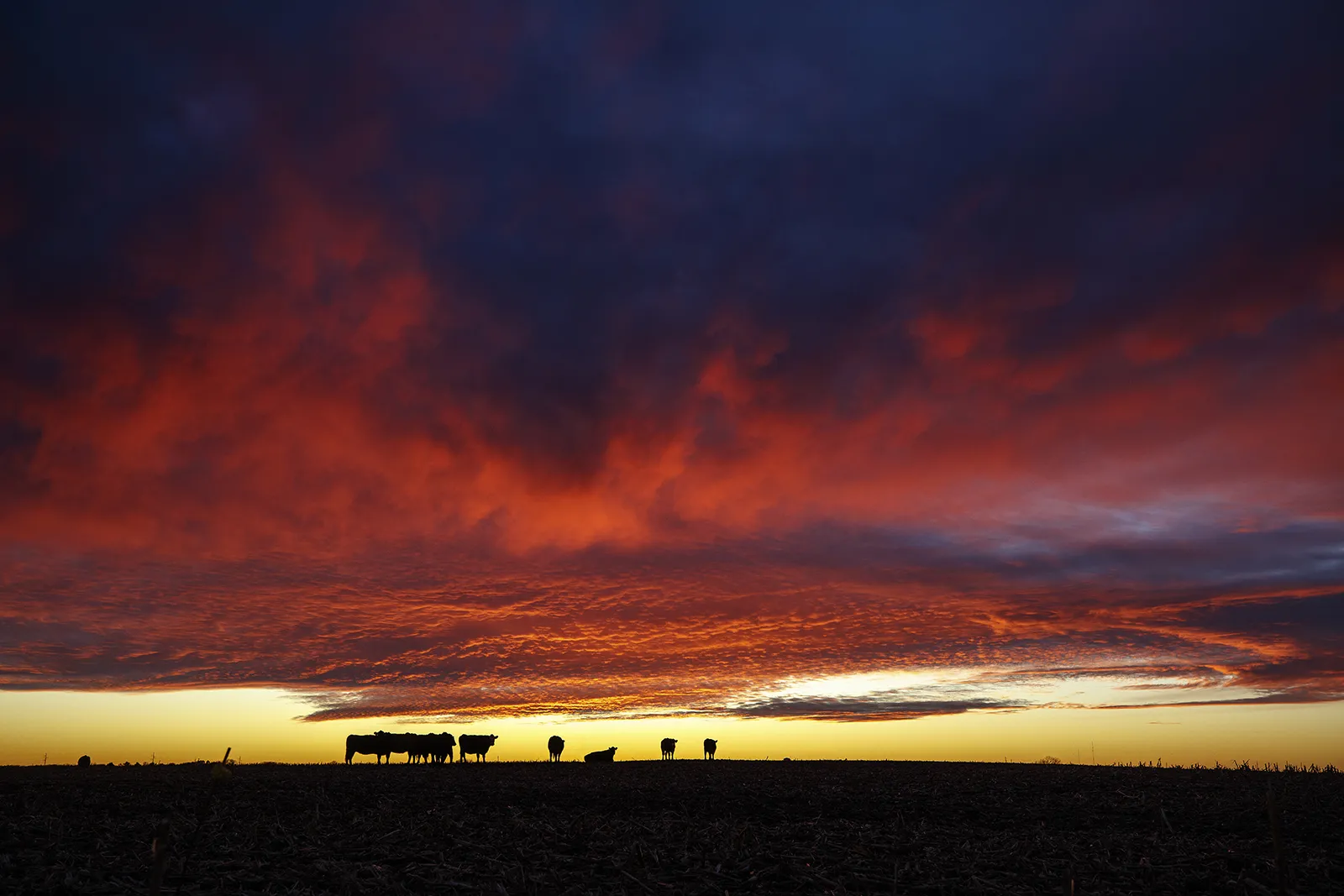 Cattle graze on a ridge line as the just-set sun turns the clouds ablaze.