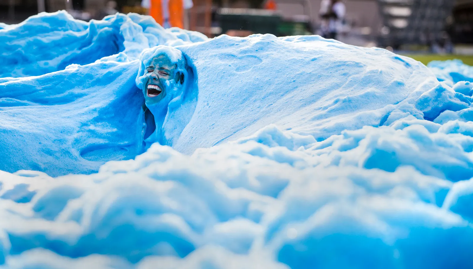 Brigham Young University student beams as she's encircled in a blue wave of foam.