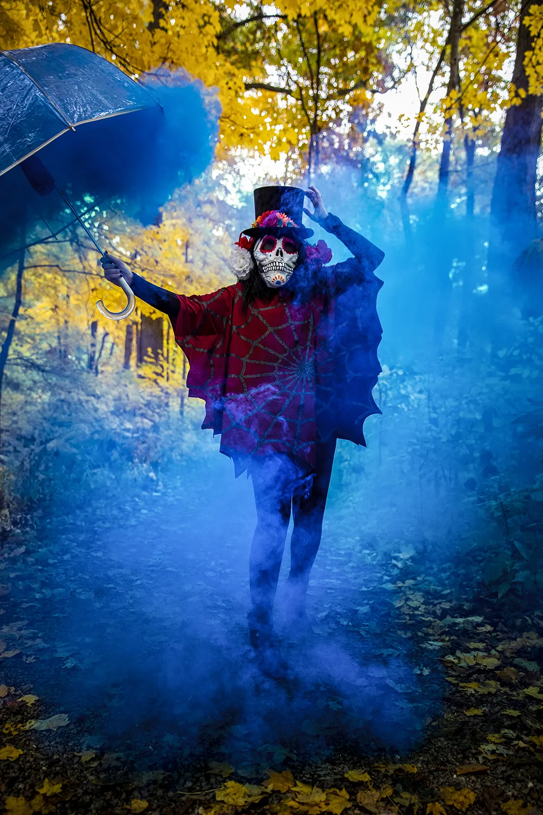 A Halloween celebrator dances with a smoke bomb in Christy Woods at Ball State University.