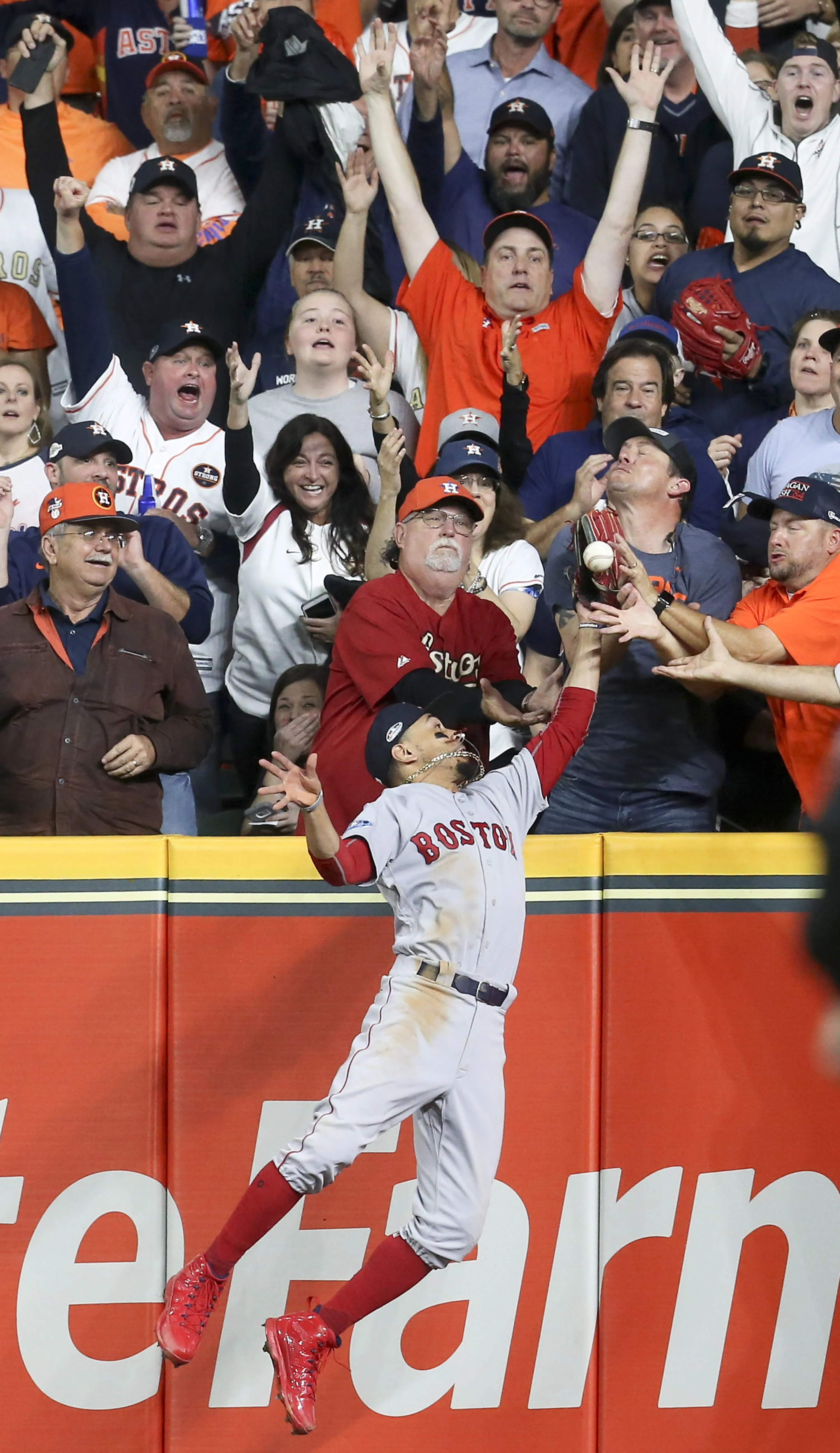 Oct 17, 2018; Houston, TX, USA; Houston Astros second baseman Jose Altuve (27, not pictured) is called out after a fan interference call on Boston Red Sox right fielder Mookie Betts (50) during the first inning in game four of the 2018 ALCS playoff baseball series at Minute Maid Park.