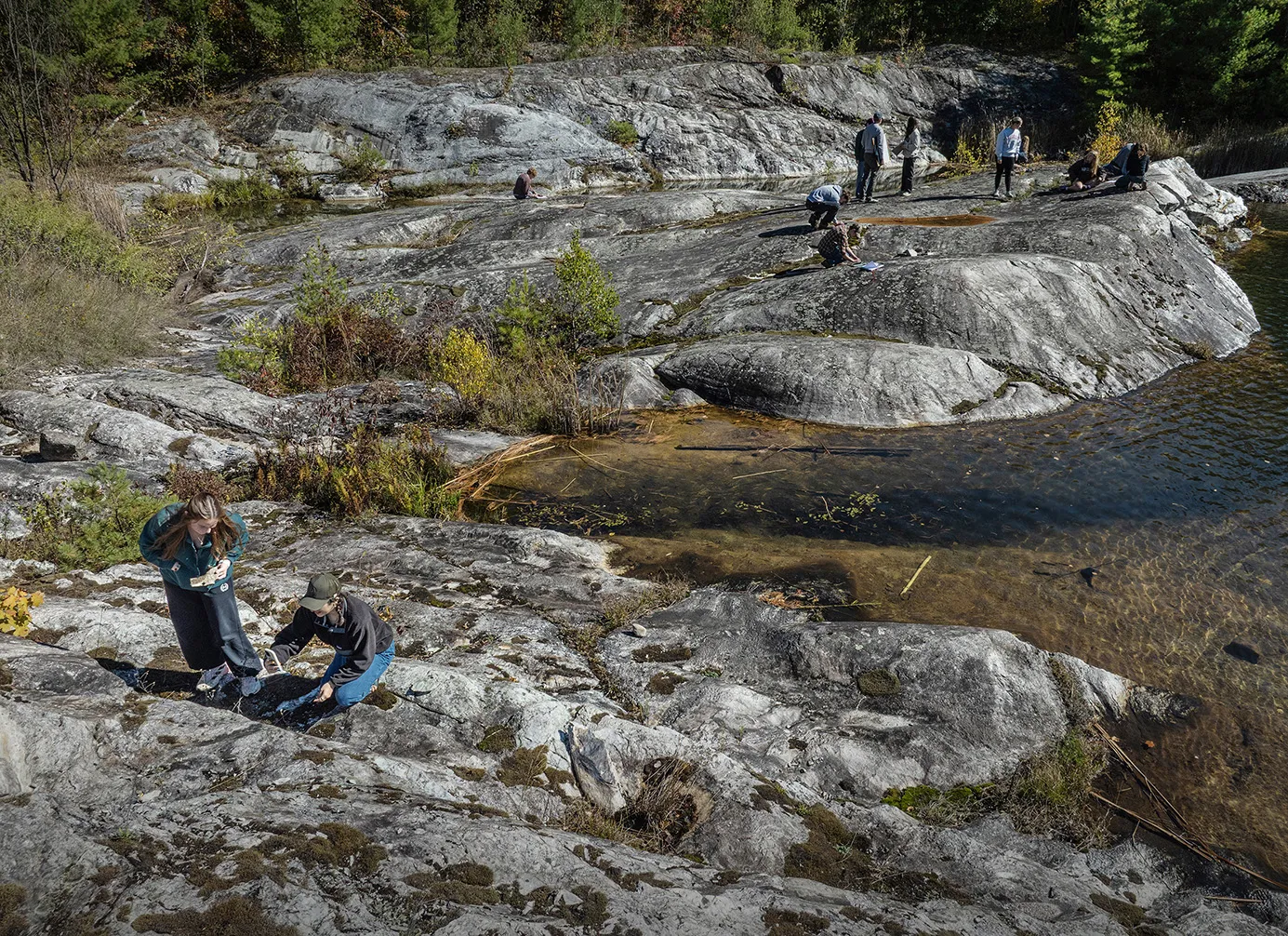 At the mineral-rich Talville Mine site, abandoned in the mid-1980s, Alexander Stewart, an Associate Professor of Geology, and his Glacial Geology class are measuring the precise orientation of geological structures in the rock layers.