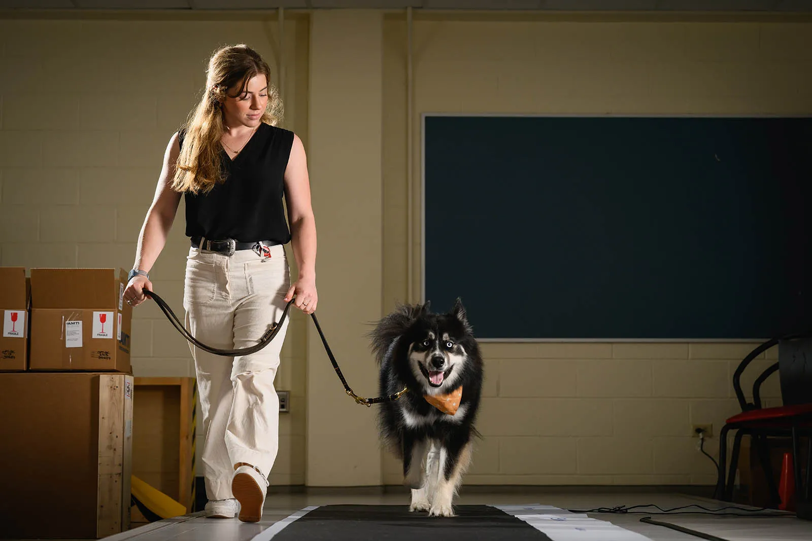 Morgan Ferrans, a postdoc in the Thinking Pets Program, demonstrates a test that measures the cadence and pressure of a dog's gait.
