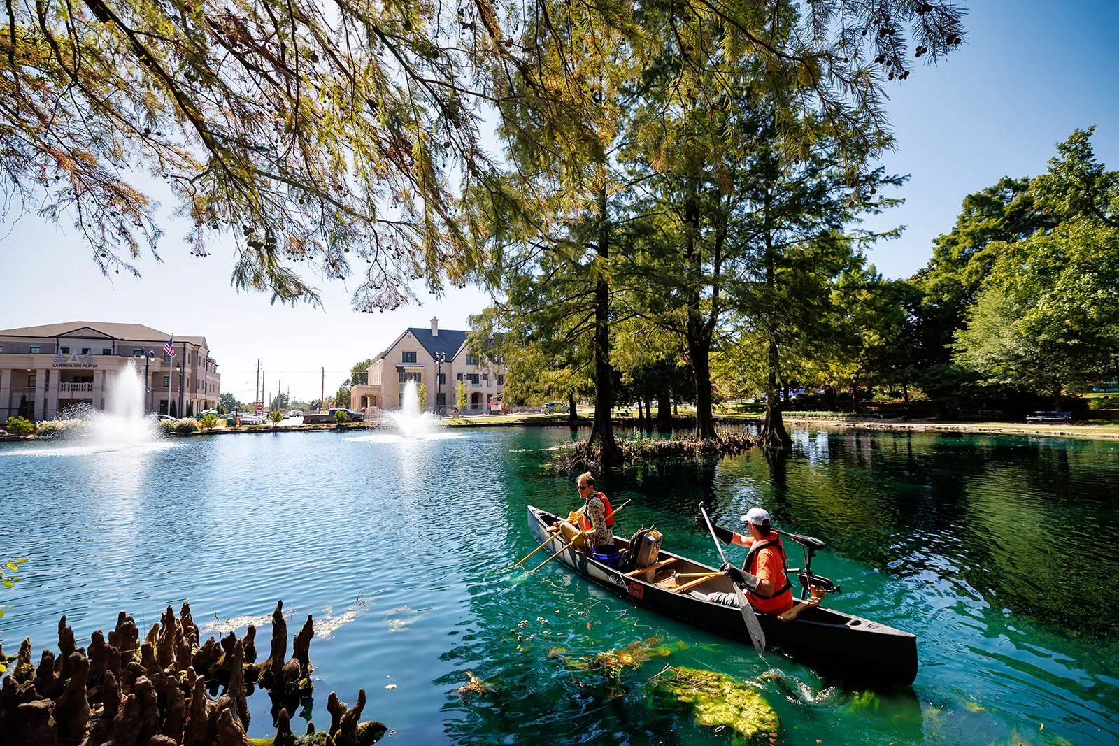 The American Fisheries Club of Oklahoma State surveys, measures, and identifies fish in Theta Pond at Oklahoma State University in Stillwater on Friday, Oct. 10, 2025. Using a canoe, club members float around the edge of the pond with an electroshock pole. Fish are placed in a bucket before being brought to shore to be cataloged.