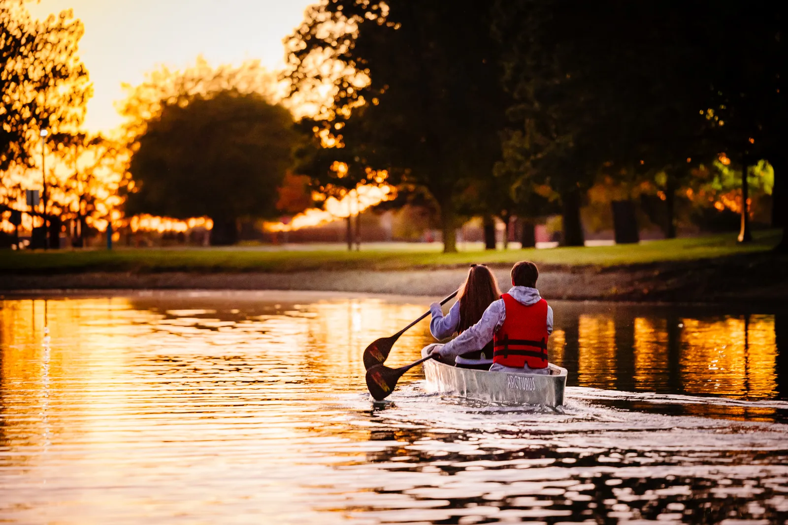 Periodically our Engineering students take their concrete canoe out to the Polar Bear pond for research and practice for the competitions they enter each year. They forgot how early the sun was starting to set on this particular day which made the event both scientific and beautiful.