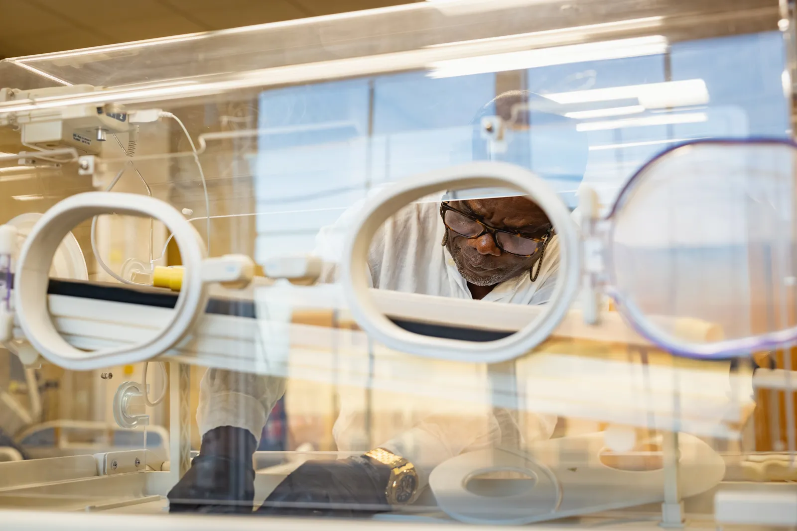 Student in the Biomedical Technology Lab working in an infant incubator.