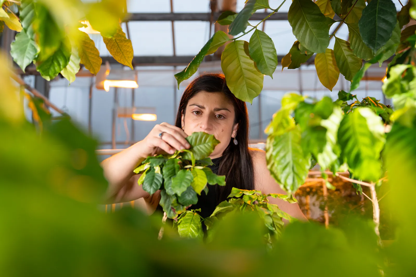 Postdoc Terry Torres Cruz inspects her coffee plants in the Lilly Greenhouse in West Lafayette, Ind. on Wednesday, Oct. 15, 2025.