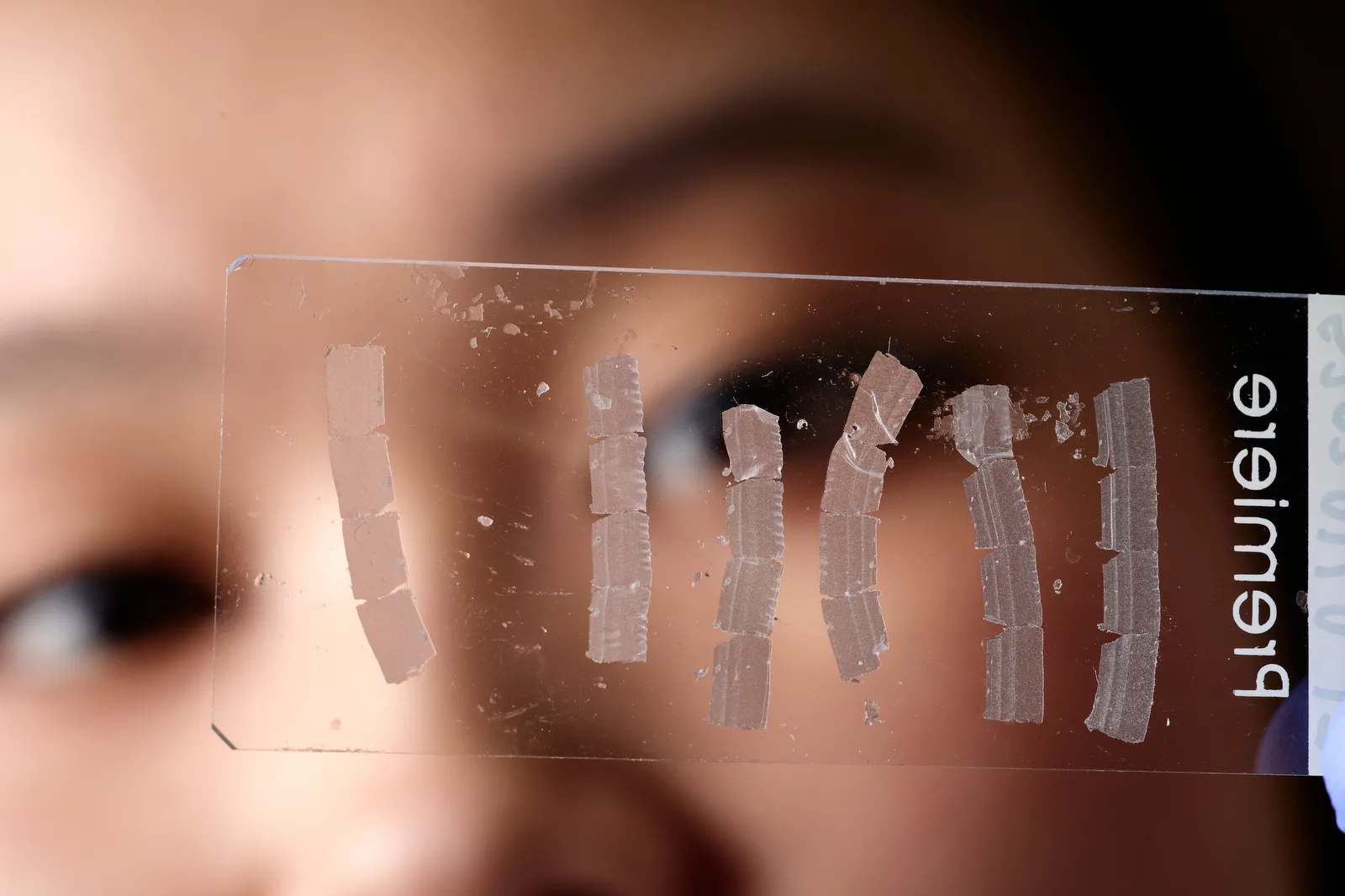 Undergraduate Leyna Tran looking at a slide in lab where they research how frogs regenerate eyes to better learn how some animals can regenerate lost organs as step towards developing novel therapeutics for regenerative medicine.