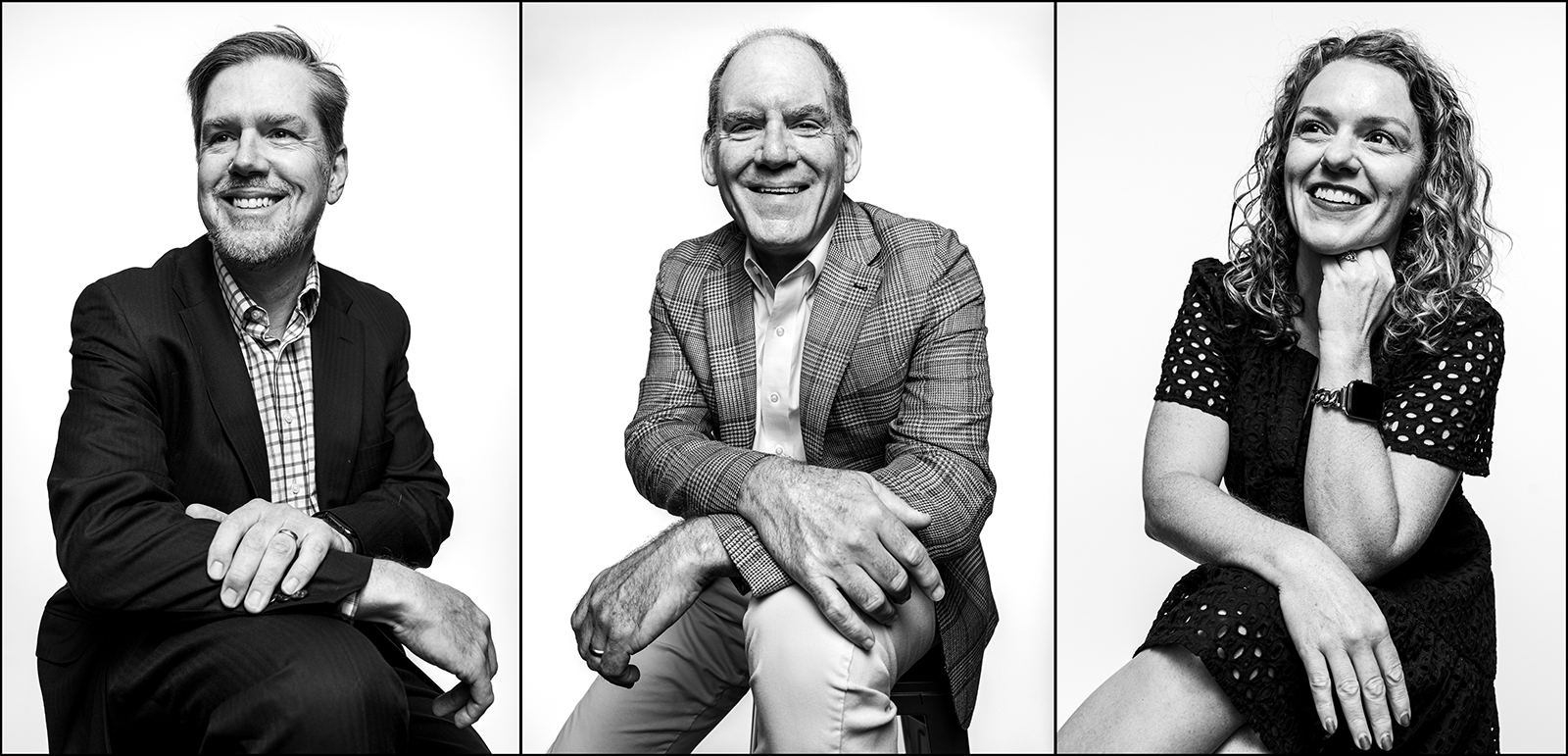 From left, Dr. Jerry Kane, Professor and C. Herman and Mary Virginia Terry Chair in Business Administration at the Terry College of Business , Professor Christopher Cornwell, PhD., Director of the Center for Business Analytics and Insights, and Director of the J.M. Tull School of Accounting Margaret Christ, PhD, pose for their portraits in October 2024 in Athens, Ga. The trio represent the main departments pooling resources to create the new Ivester Center for Business Analytics and insights at the Terry College of Business.