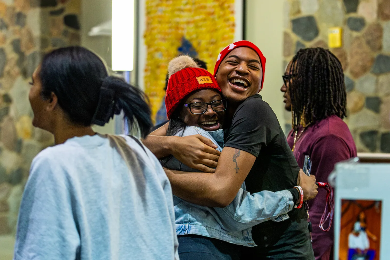 A’zla Robinson, a senior nursing major, shares a warm hug with Jasiah, a first-year student, during the Blackout showcase in the Mary Idema Pew Library atrium on Feb. 5. The showcase brings together Black student organizations from across campus to celebrate culture and community during Black History Month.