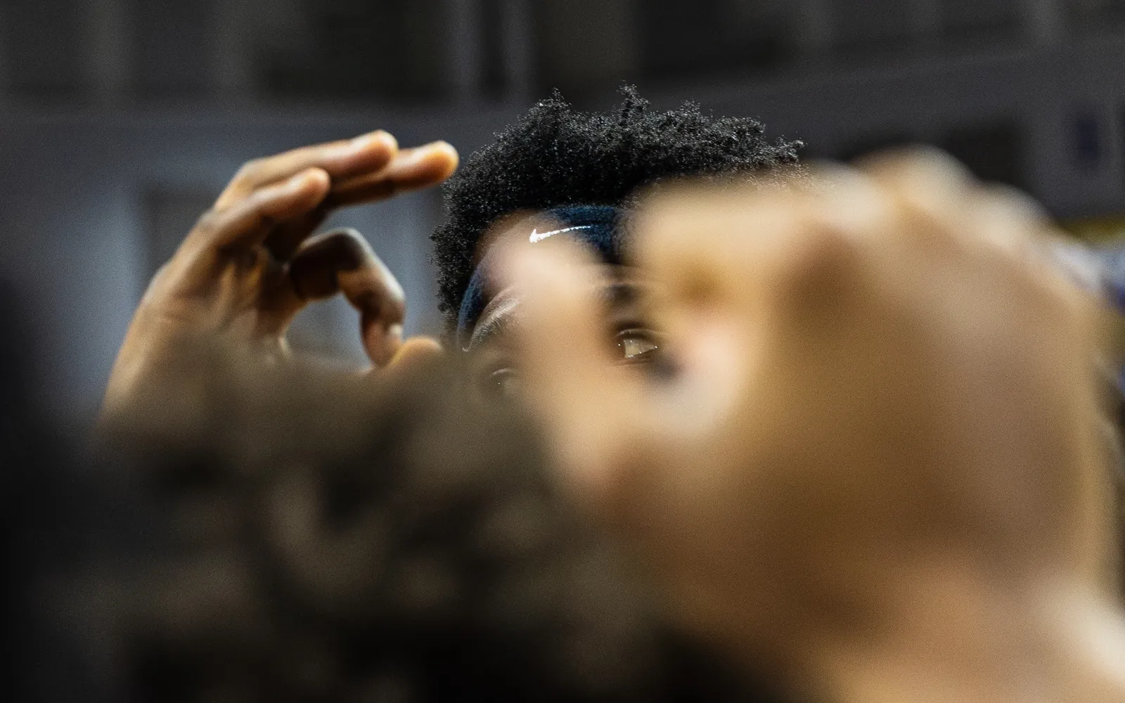 Victory Onuetu of the Hofstra University Men's Basketball Team eyes his teammates during pregame rituals