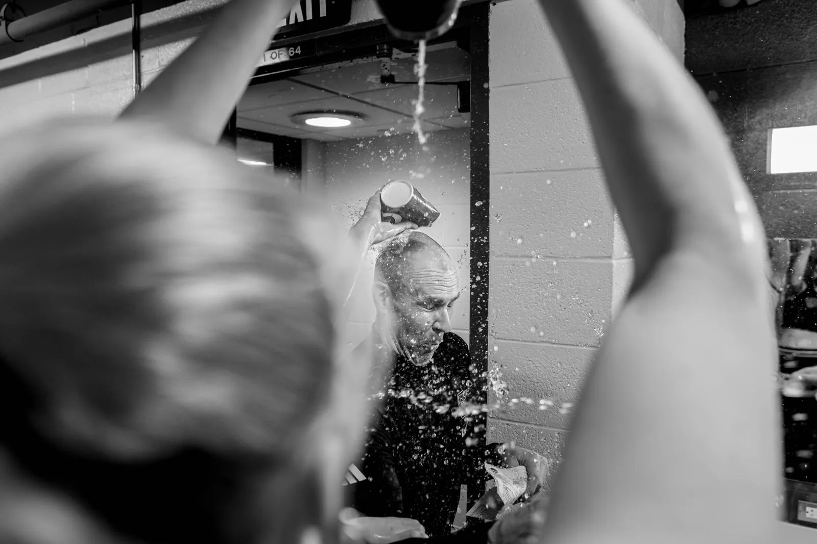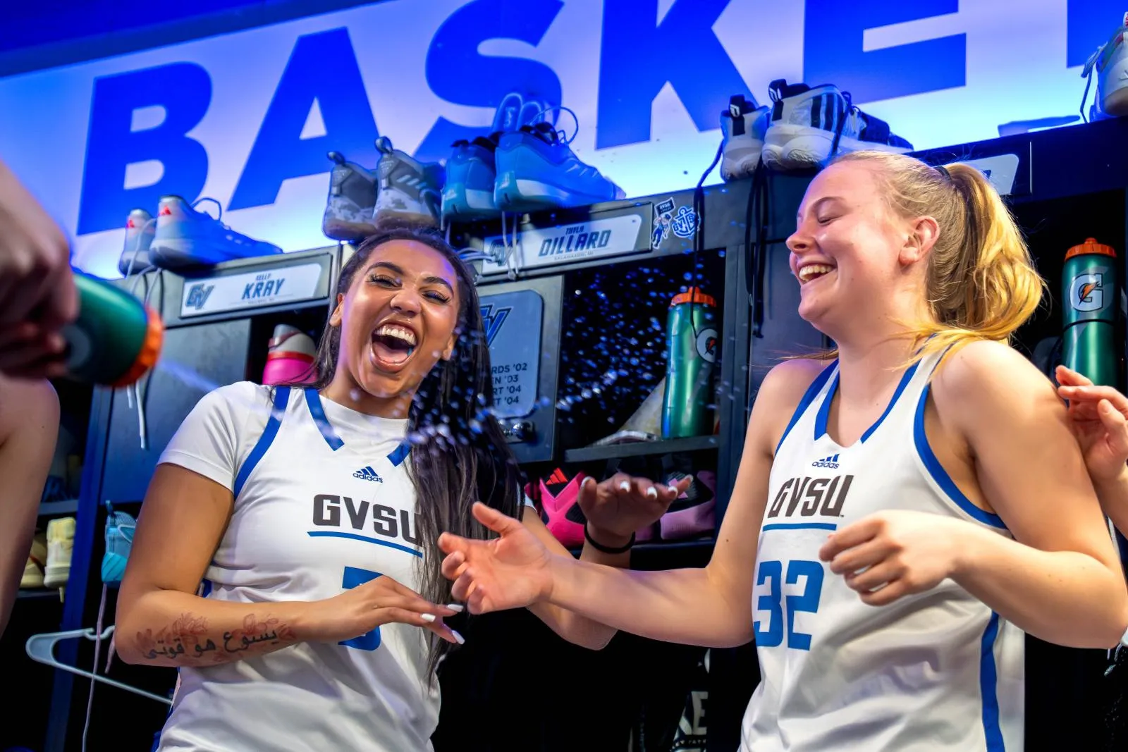 The women's Grand Valley State basketball team celebrates in their locker room after defeating Ferris State rivals.