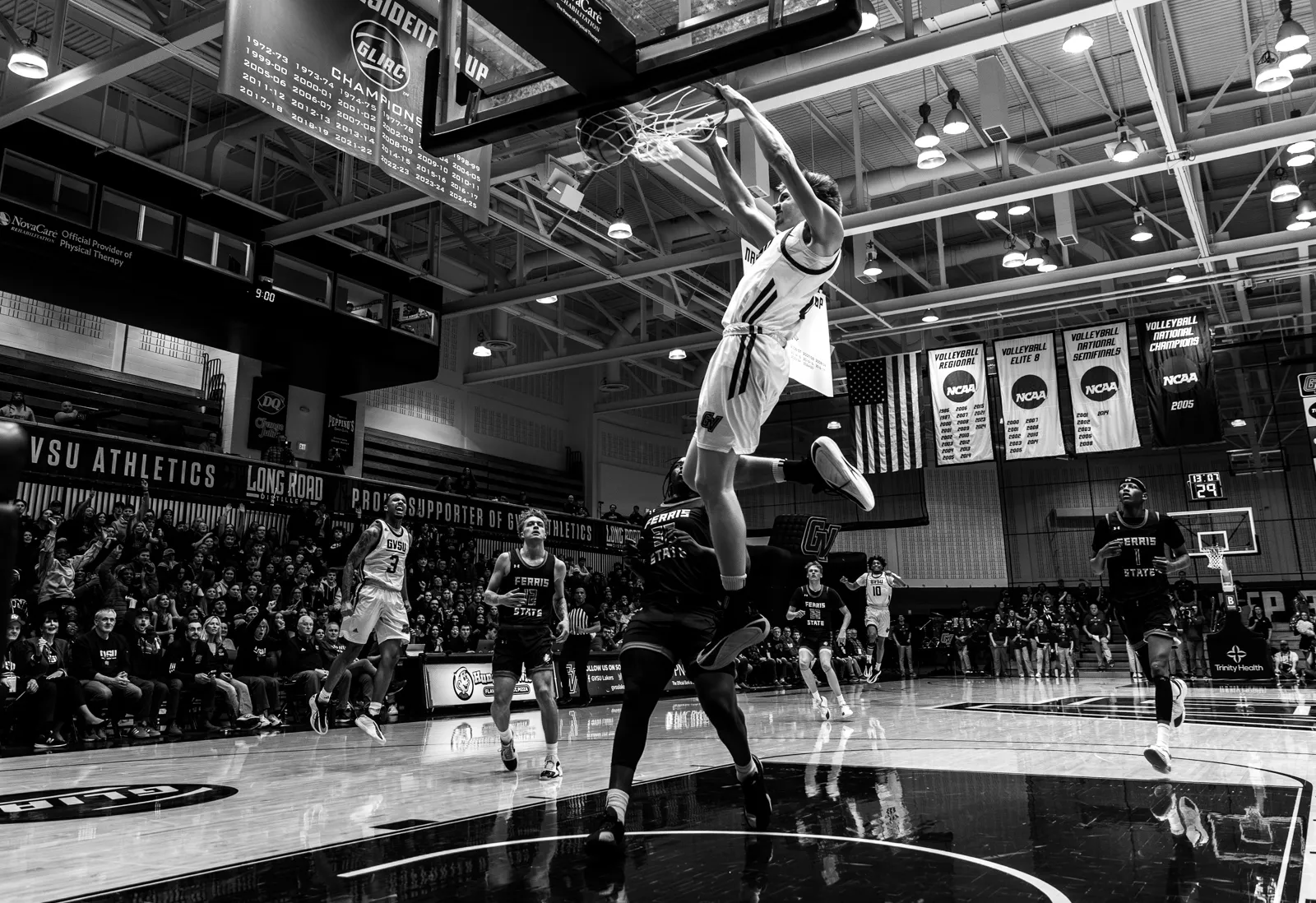 Grand Valley State’s Cam Regnerus throws down a dunk during a rivalry matchup against Ferris State at the GVSU Fieldhouse Arena in Allendale, Michigan. The slam marked Grand Valley’s only dunk of the game against their longtime rival, and sent the packed Fieldhouse erupting with excitement.