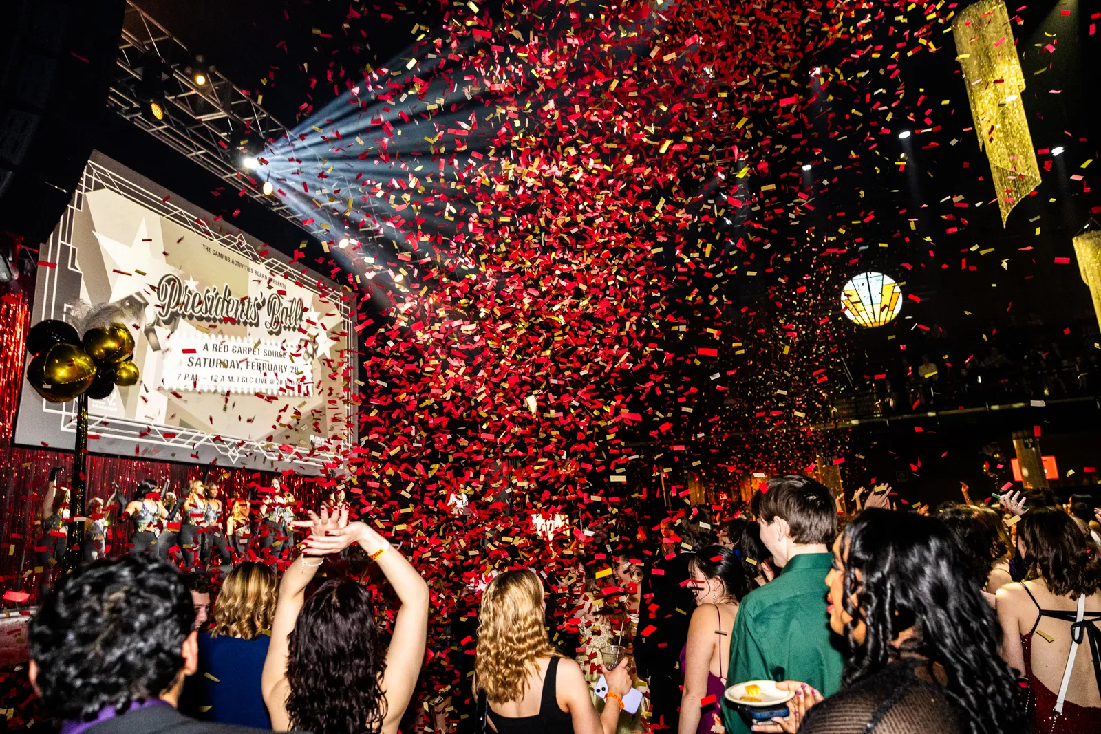 Confetti falls over students during Grand Valley State University’s annual President’s Ball on Feb. 28 at 20 Monroe Live in Grand Rapids, Michigan. Students raise their hands beneath falling confetti following a performance by the Laker Dance Team during one of the university’s longest-running traditions, held for nearly 40 years.
