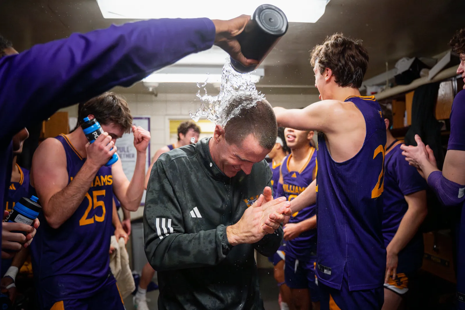 Williams College Men's Basketball Head Coach Kevin App gets drenched in water by his team after a 70-56 win to end the regular season versus rivals Amherst College.