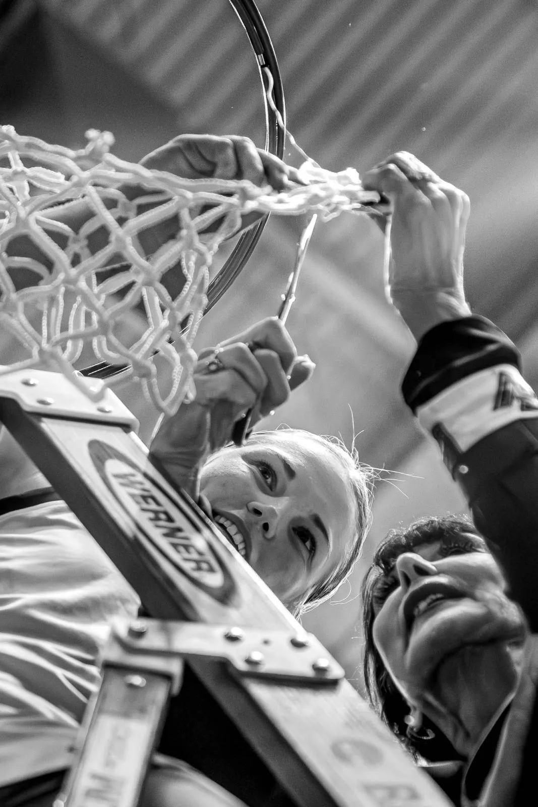 Grand Valley State women's basketball player cuts the net with University President Philomena V. Mantella, after winning against Ferris State University.