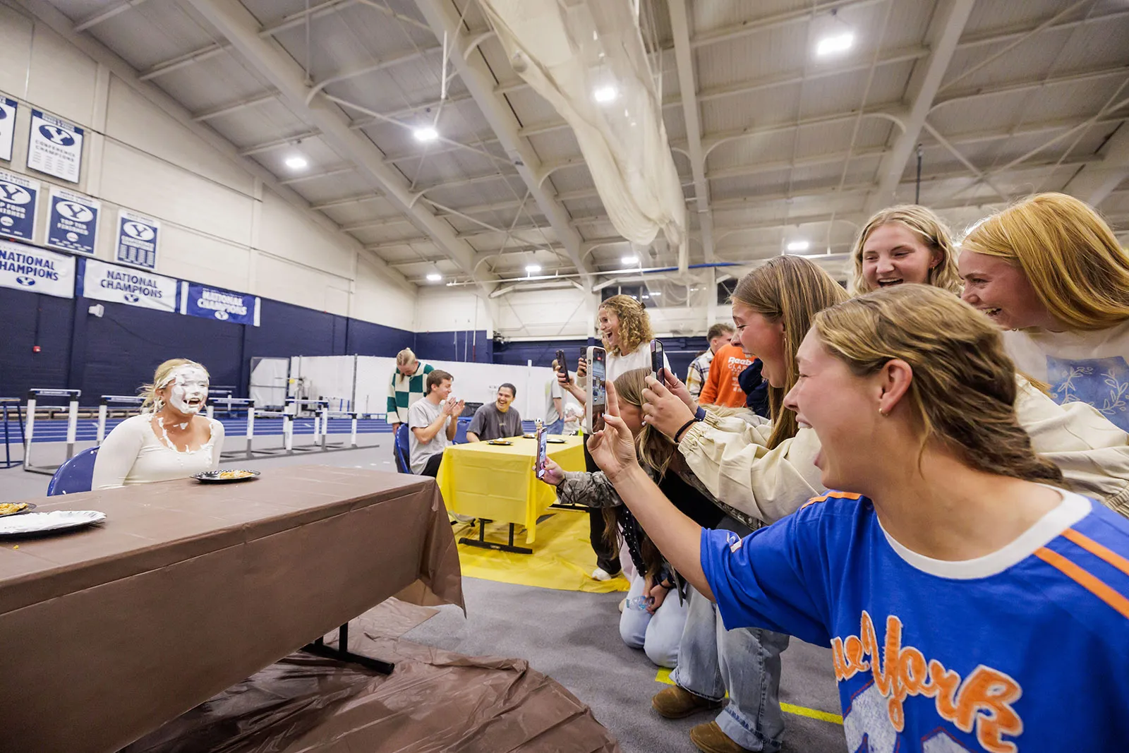 Student athletes react to pie eating contest that ended with the loser getting pied in the face.