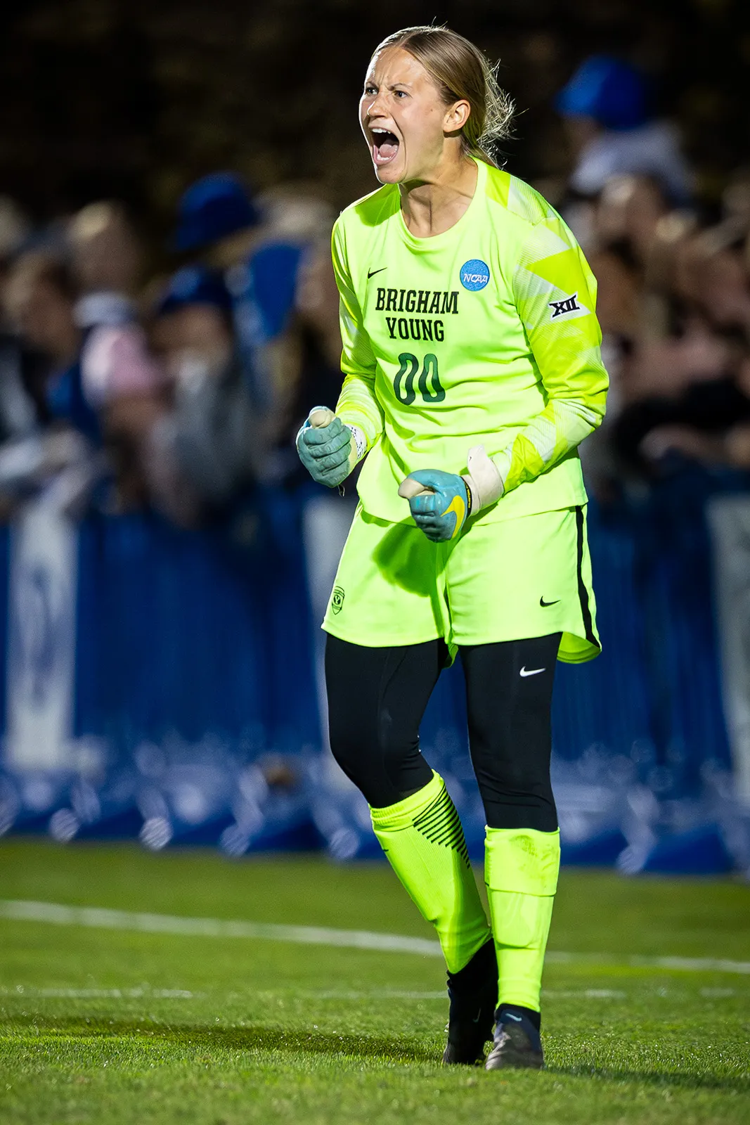 The goalie celebrates after blocking a goal during a 11 round penalty shootout.