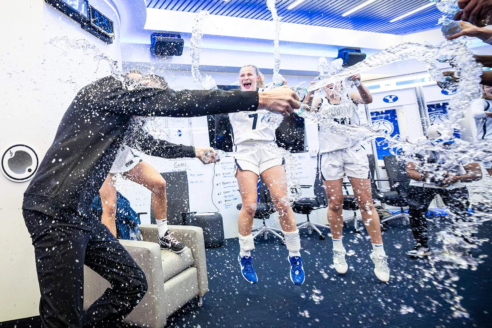 Women's Basketball team celebrates first official win of the season by having a water war after the game.