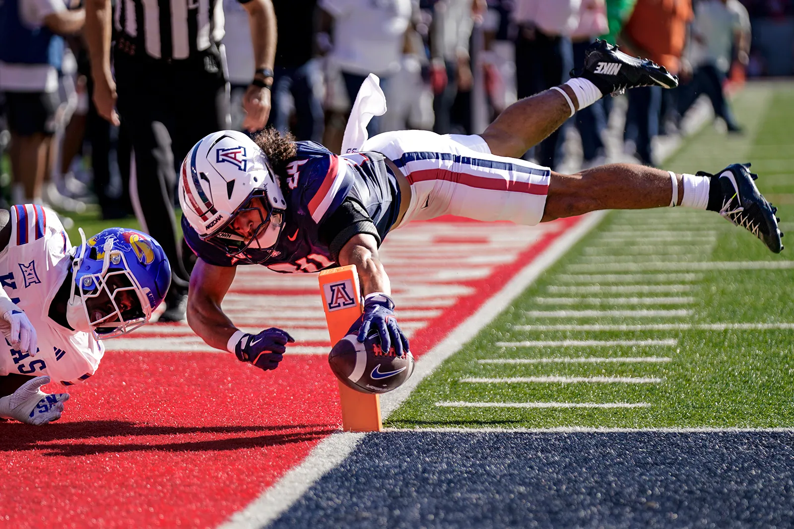 TUCSON, ARIZONA - NOVEMBER 08: Quincy Craig #24 of the Arizona Wildcats dives into the end zone to score a touchdown during the second quarter at Arizona Stadium on November 08, 2025 in Tucson, Arizona. (Photo by Patrick Mulligan)