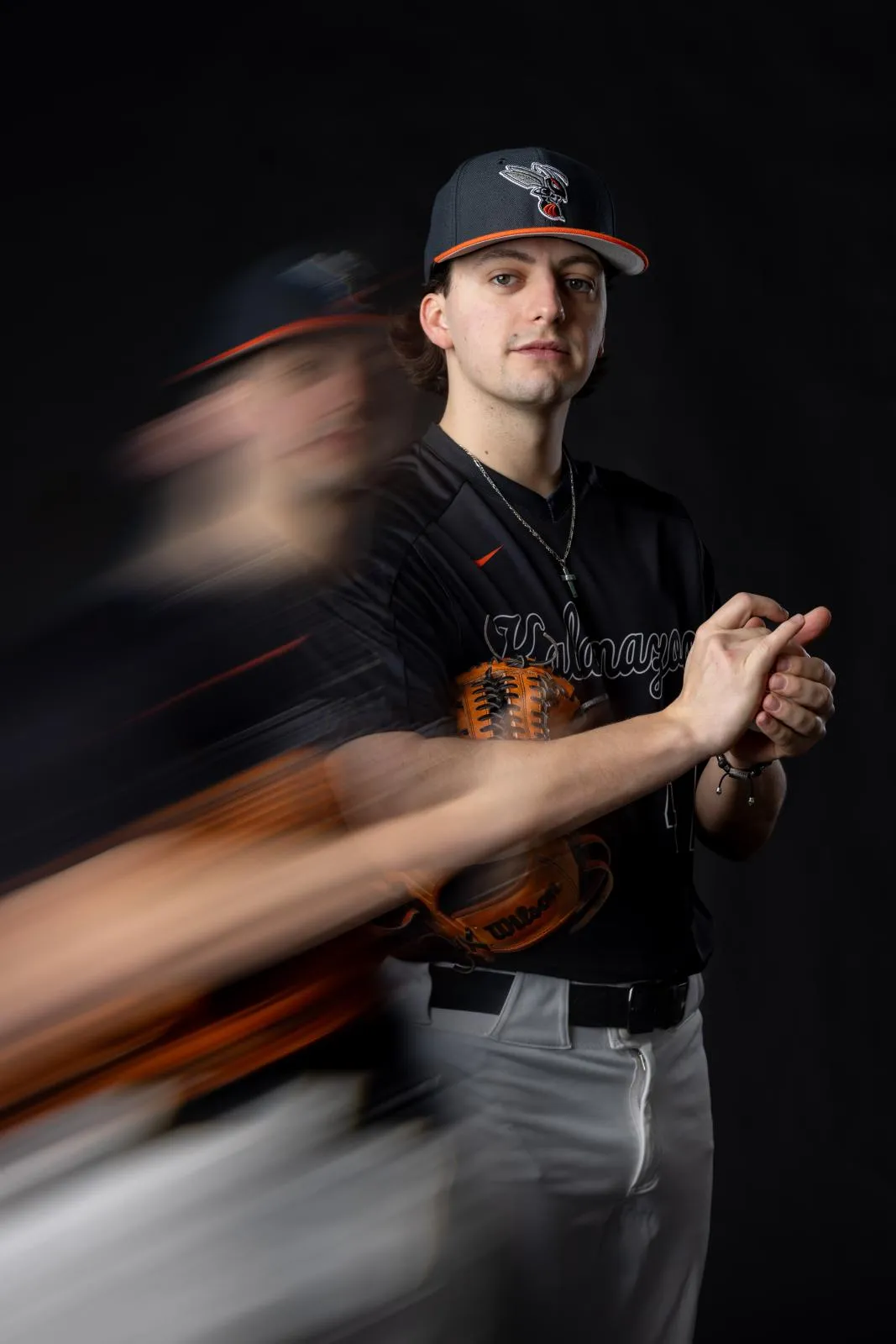A long exposure captures two Towson University Dance Company members moving across the studio.
