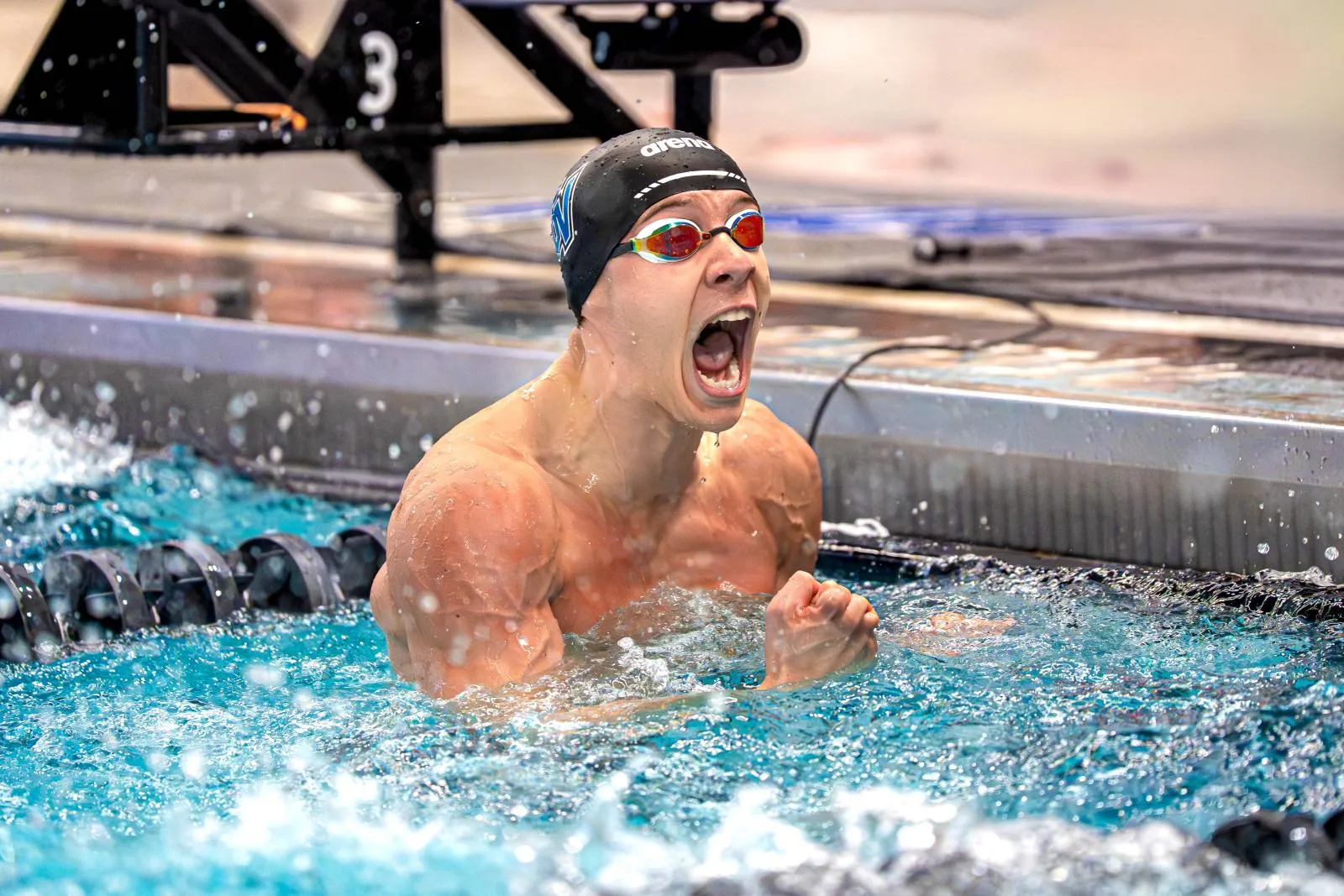 Grand Valley State swimmer, Evan Scotto, celebrates breaking another career record.