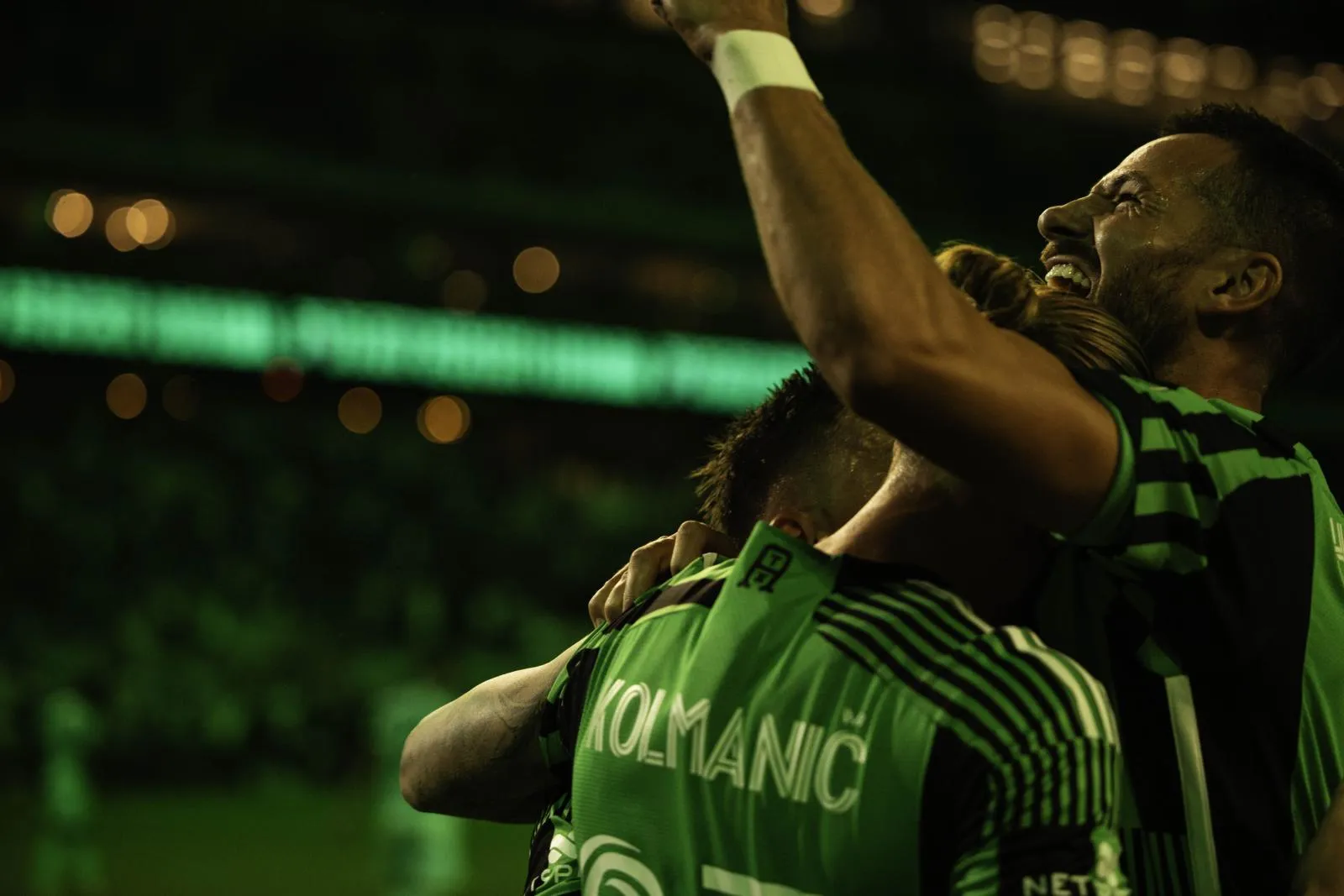 Austin FC players celebrating after the last goal of the last game of regular season.