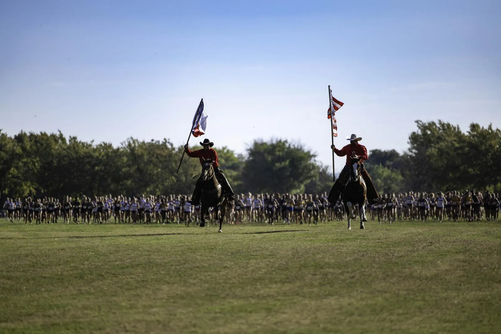 Start of the Women's DBU Old Glory Gallop cross country meet, the iconic race features two horses that start the race with the runners carrying a flag of the United States and Texas