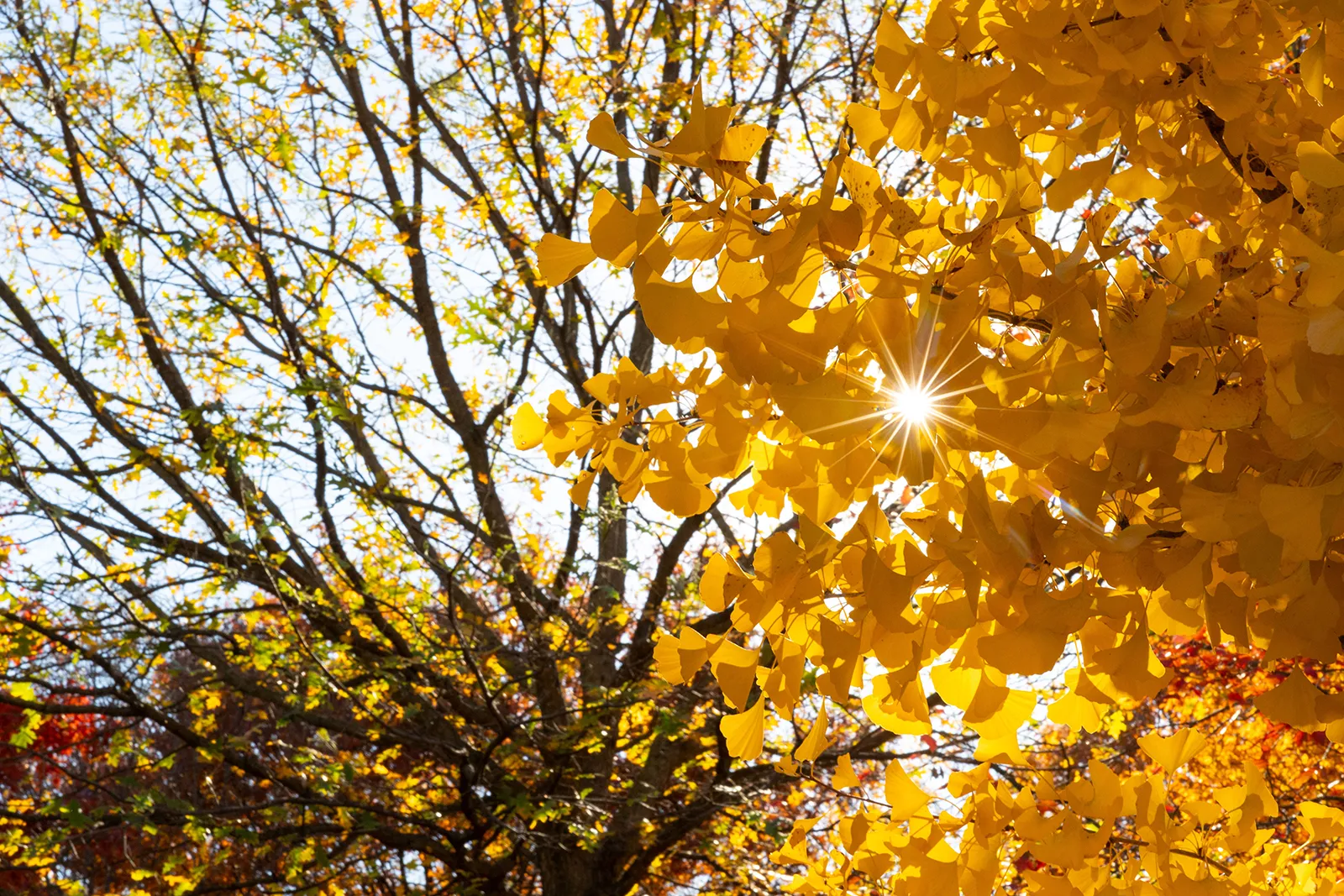 A sun flare bursts through fall foliage on the Center for Young Children's playground.