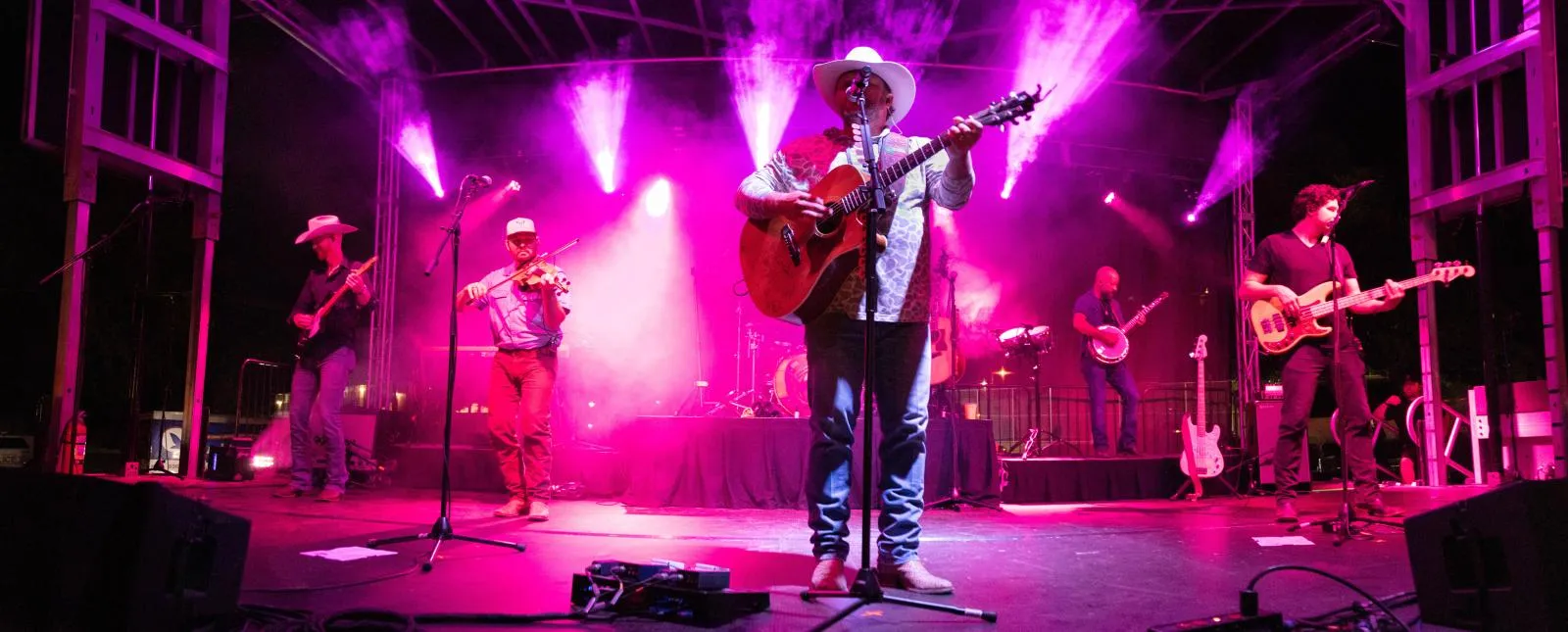 A panoramic photograph of The Josh Abbot Band as they perform for Stephen F. Austin State University's Homecoming Concert and Bonfire.