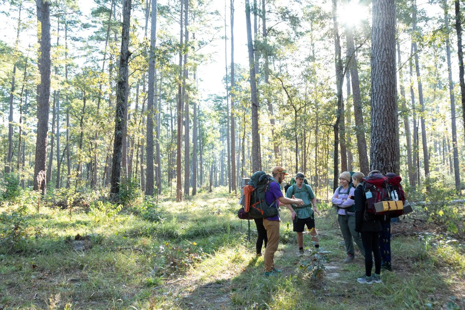 On the final day of a 12-mile hike along the Four C National Recreation Trail in Davy Crockett National Forest, participants chat before hiking out. This trip was led and organized by Stephen F. Austin State University’s Outdoor Pursuits and lasted for one and a half days.